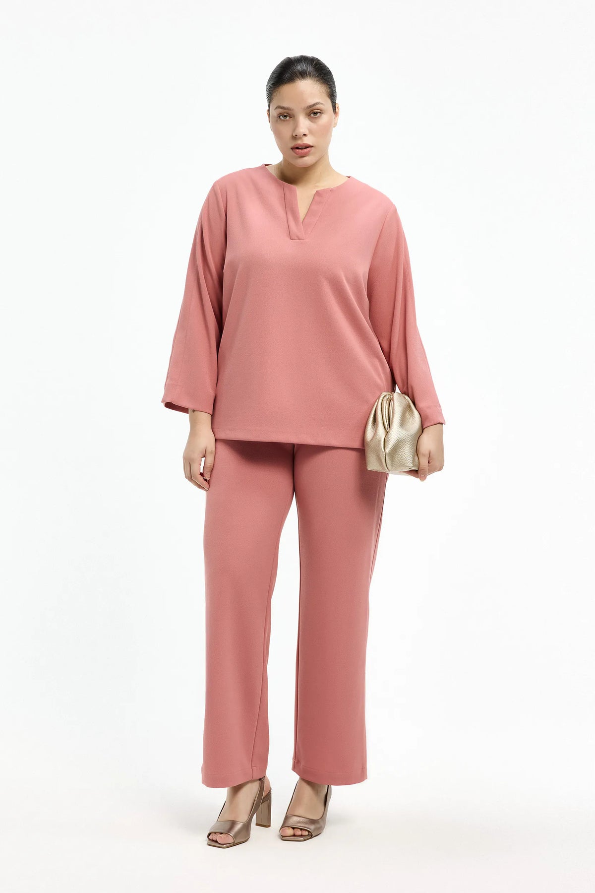 De blouse heeft een subtiele V-hals met een verfijnde split, wat zorgt voor een elegante en flatterende halslijn. Dit detail geeft het model een vrouwelijke uitstraling en zorgt ervoor dat de blouse mooi openvalt rond de hals. Binnen moderne dameskleding grote maten is dit een geliefd detail omdat het het silhouet visueel verlengt en een stijlvolle look creëert.