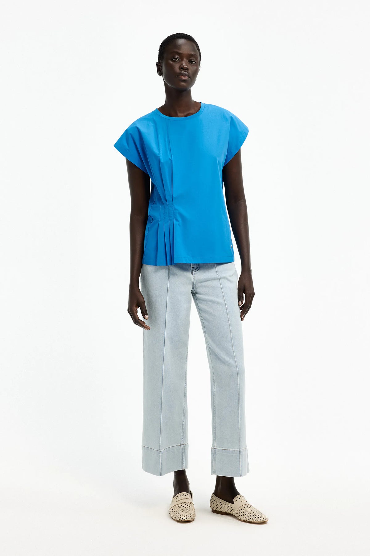 Deze helderblauwe blouse van Xandres is een stijlvol statement voor elke dag. Het model is vervaardigd uit 100% biologisch katoen, wat niet alleen zacht en ademend is, maar ook verantwoord geproduceerd. De soepele stof valt mooi langs het lichaam, terwijl de subtiele plooien aan de zijkant zorgen voor een elegant silhouette met een verrassend detail. De rechte pasvorm en korte kapmouwen geven het geheel een moderne, cleane look, terwijl de ronde hals zorgt voor een tijdloze en flatterende afwerking.