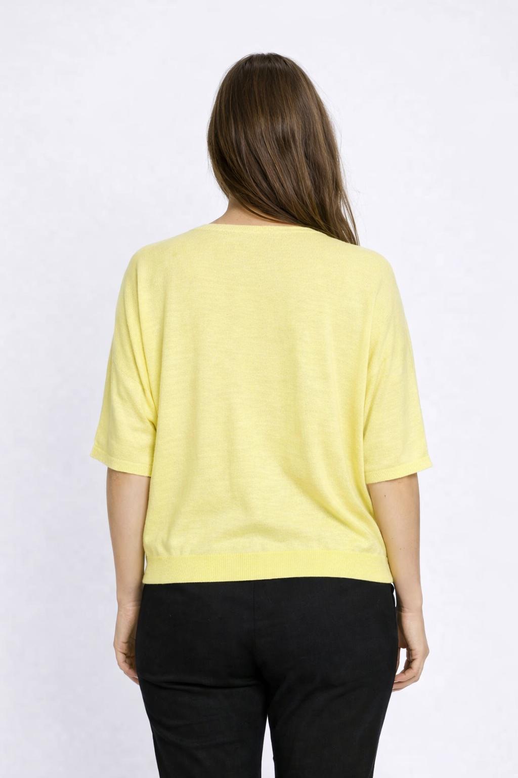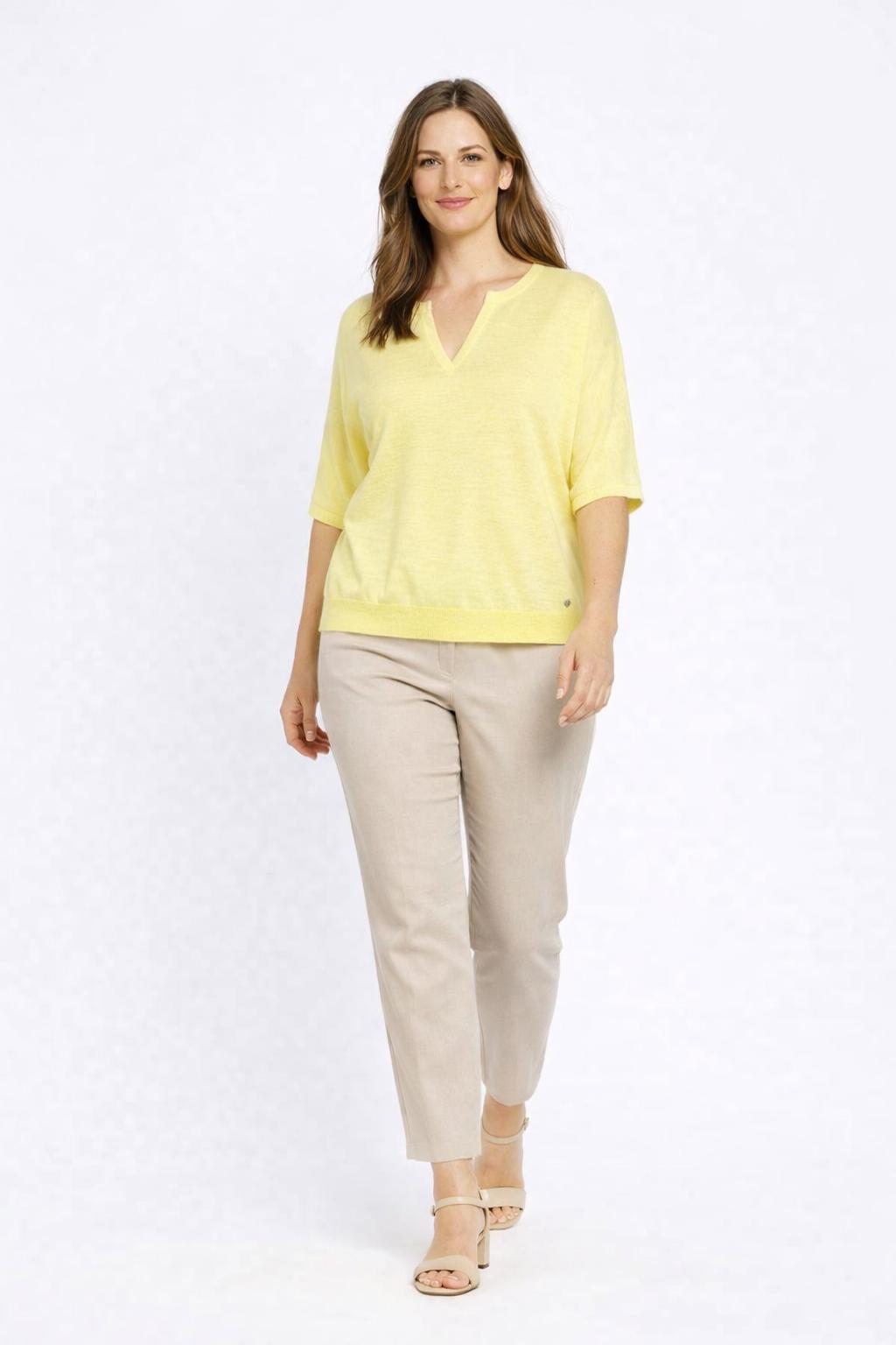 De fijne V-hals met afgeronde inkeping zorgt voor een elegante halslijn die mooi opent, zonder te diep te zijn. De tricotboord onderaan geeft de top een licht bloezend effect dat zorgt voor een moeiteloze pasvorm – losjes, maar toch gekleed. De heldere, citroengele kleur straalt energie en stijl uit en laat zich verrassend makkelijk combineren: denk aan een witte linnen broek voor een casual-chique look, of een donkere jeans voor een fris contrast.