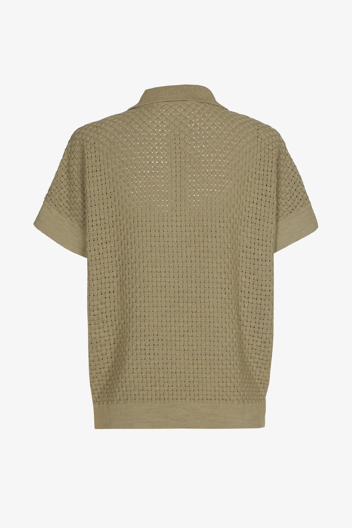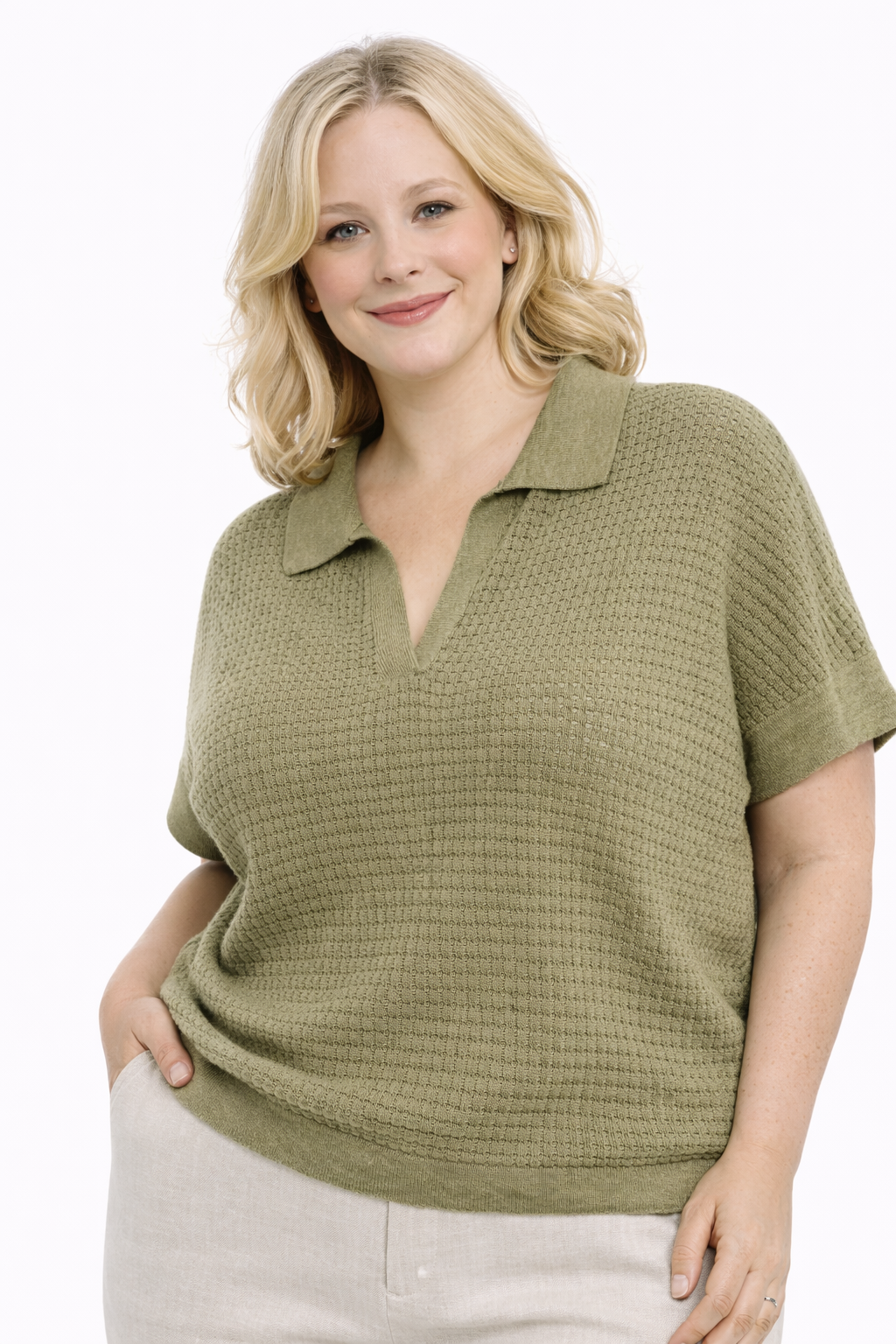 Het model heeft een elegante polokraag met een vrouwelijke V-halsuitsnijding, waardoor het perfect combineert met zowel een geklede broek als een casual short of rok. De trui valt soepel rond het lichaam en is licht oversized, ideaal voor vrouwen met rondingen die houden van stijlvolle mode zonder in te boeten op comfort. De korte mouwen zijn mooi afgewerkt met een gebreide boord die de look extra verfijnt. De boord aan de zoom zorgt ervoor dat het model mooi in vorm blijft.