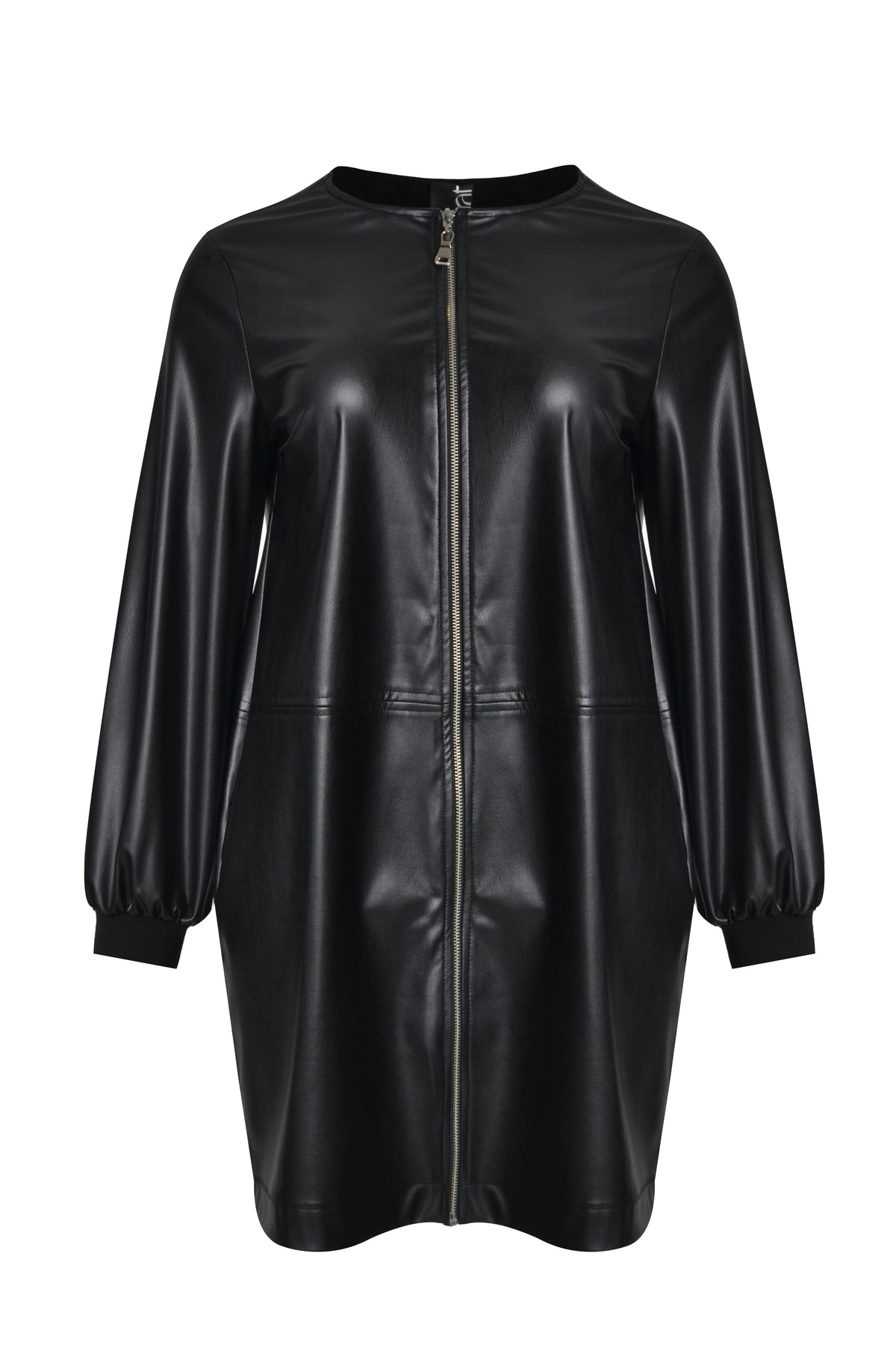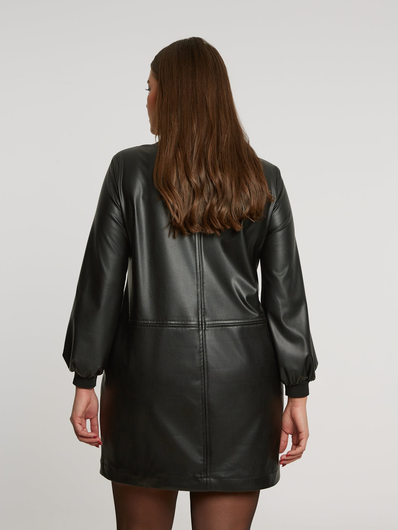 Das Kleid ist aus hochwertigem Kunstleder gefertigt, einem Material, das nicht nur optisch ansprechend, sondern auch praktisch ist. Kunstleder fühlt sich geschmeidig an, ist pflegeleicht und bietet genau die richtige Elastizität für bequeme Bewegungsfreiheit. Damit ist es perfekt für einen langen Arbeitstag, ein Abendessen oder einen Abend in der Stadt. Der Stoff ist zudem robust und strapazierfähig und sorgt für einen luxuriösen Look und Langlebigkeit. Die mattschwarze Oberfläche fängt das Licht dezent ein und verleiht dem Kleid zusätzliche Tiefe und Struktur.