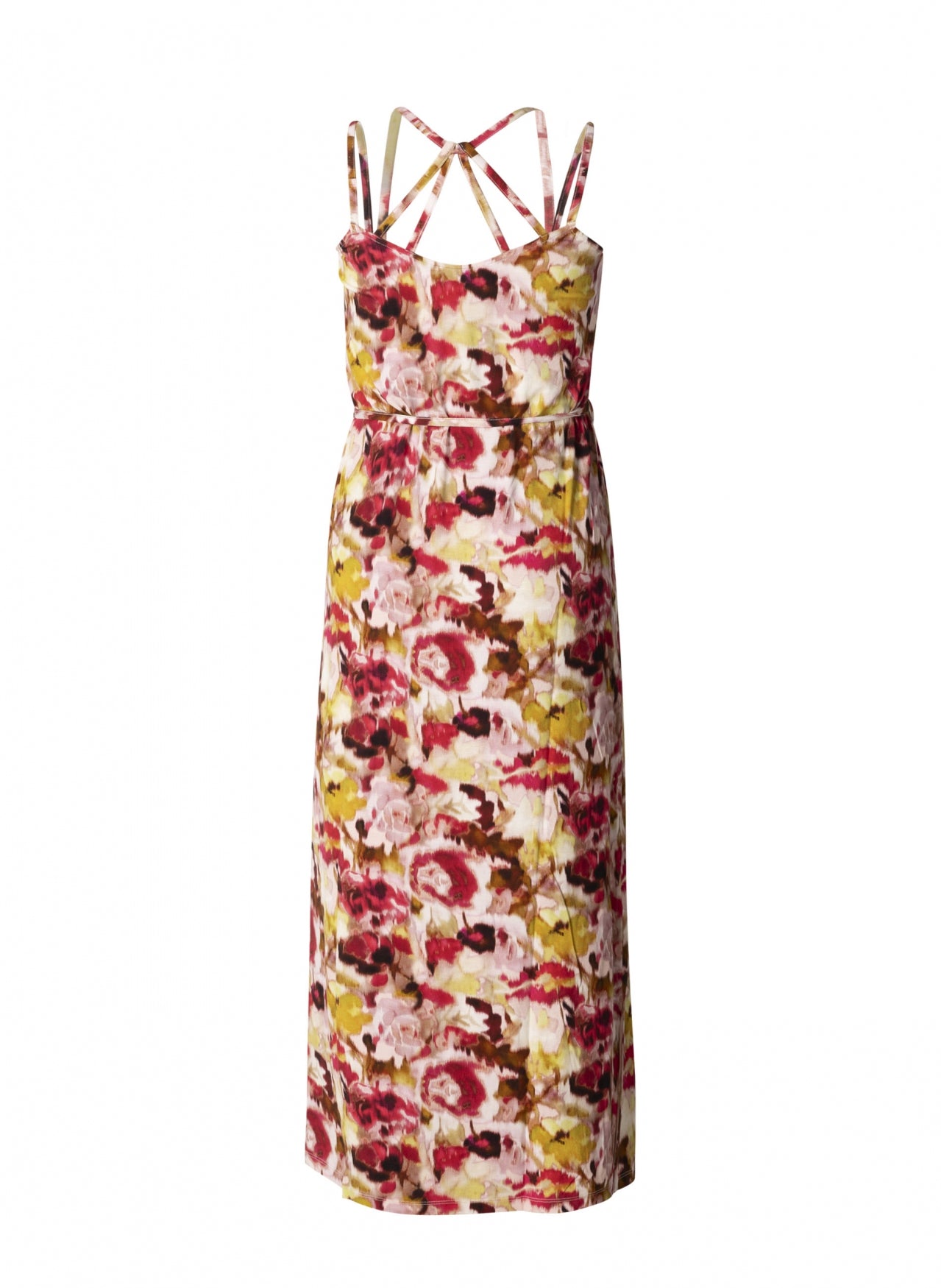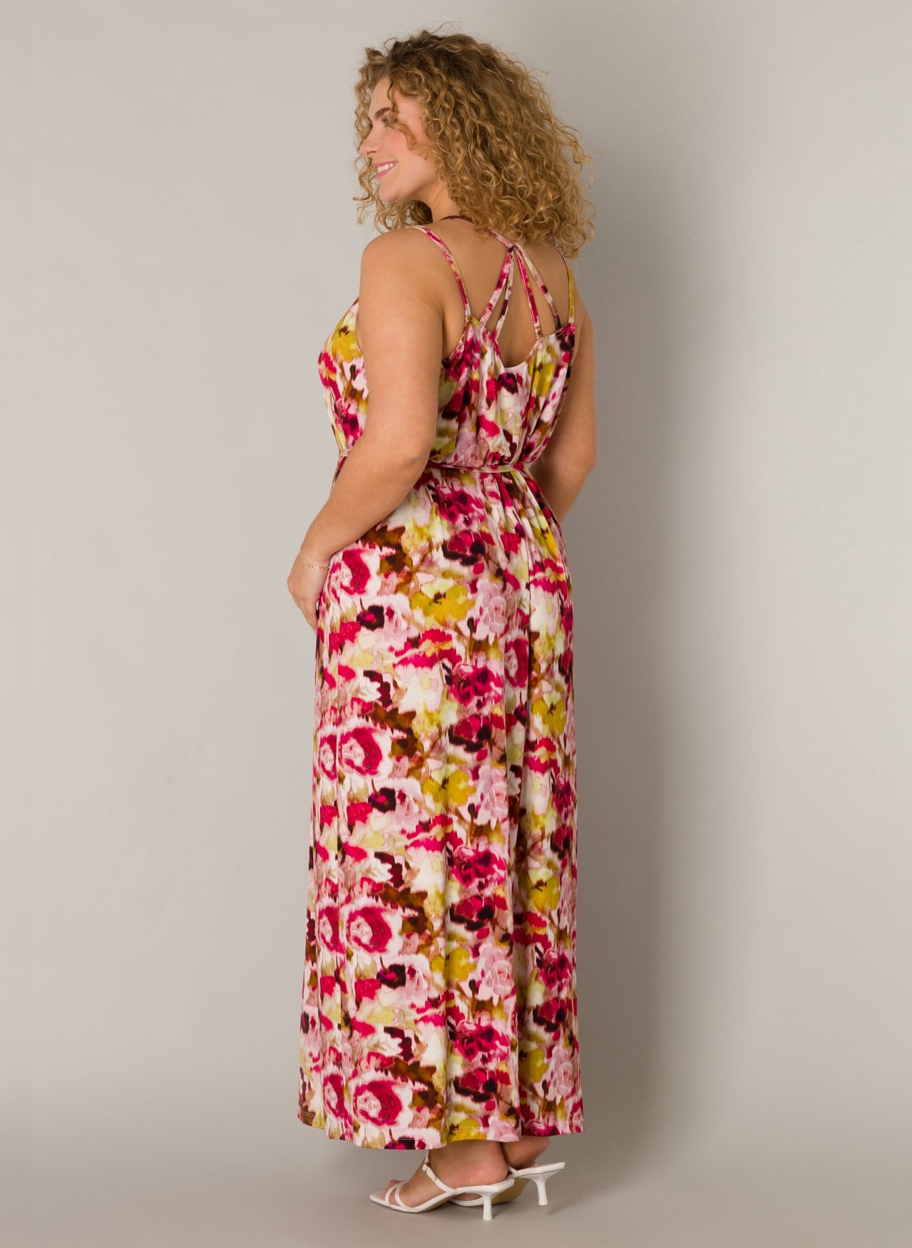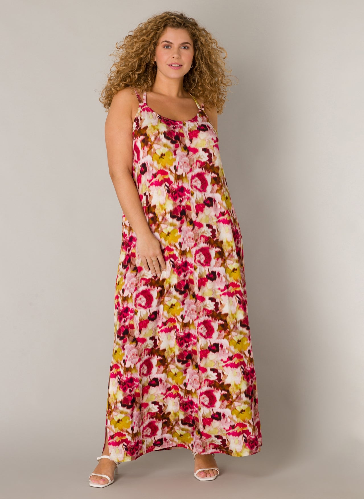 This long summer dress by Yesta is a real eye-catcher for women who love feminine plus size fashion. The floral print in pink, red and mustard shades gives the dress a lively look, while the playful shoulder straps with crossing at the back provide a surprising detail. The design combines comfort and style in one flattering cut that follows your figure beautifully without being too tight.