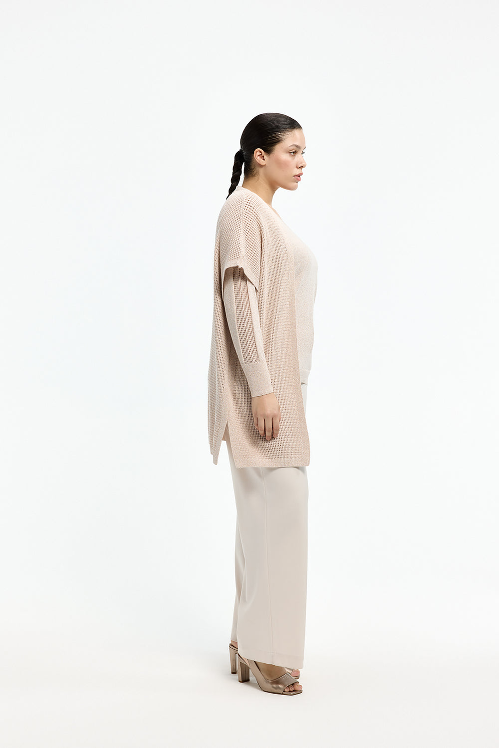 De stof voelt verrassend licht aan, maar heeft dankzij de ingeweven glans en verfijnde afwerking toch een rijke textuur. Perfect voor laagjes over een top of blouse, dit gilet leent zich zowel voor een casual dagoutfit als een verfijnde avondlook. De transparante schouderdetails geven extra luchtigheid en accentueren mooi de schouderlijn, wat zorgt voor een flatterend silhouet binnen het aanbod dameskleding grote maten.