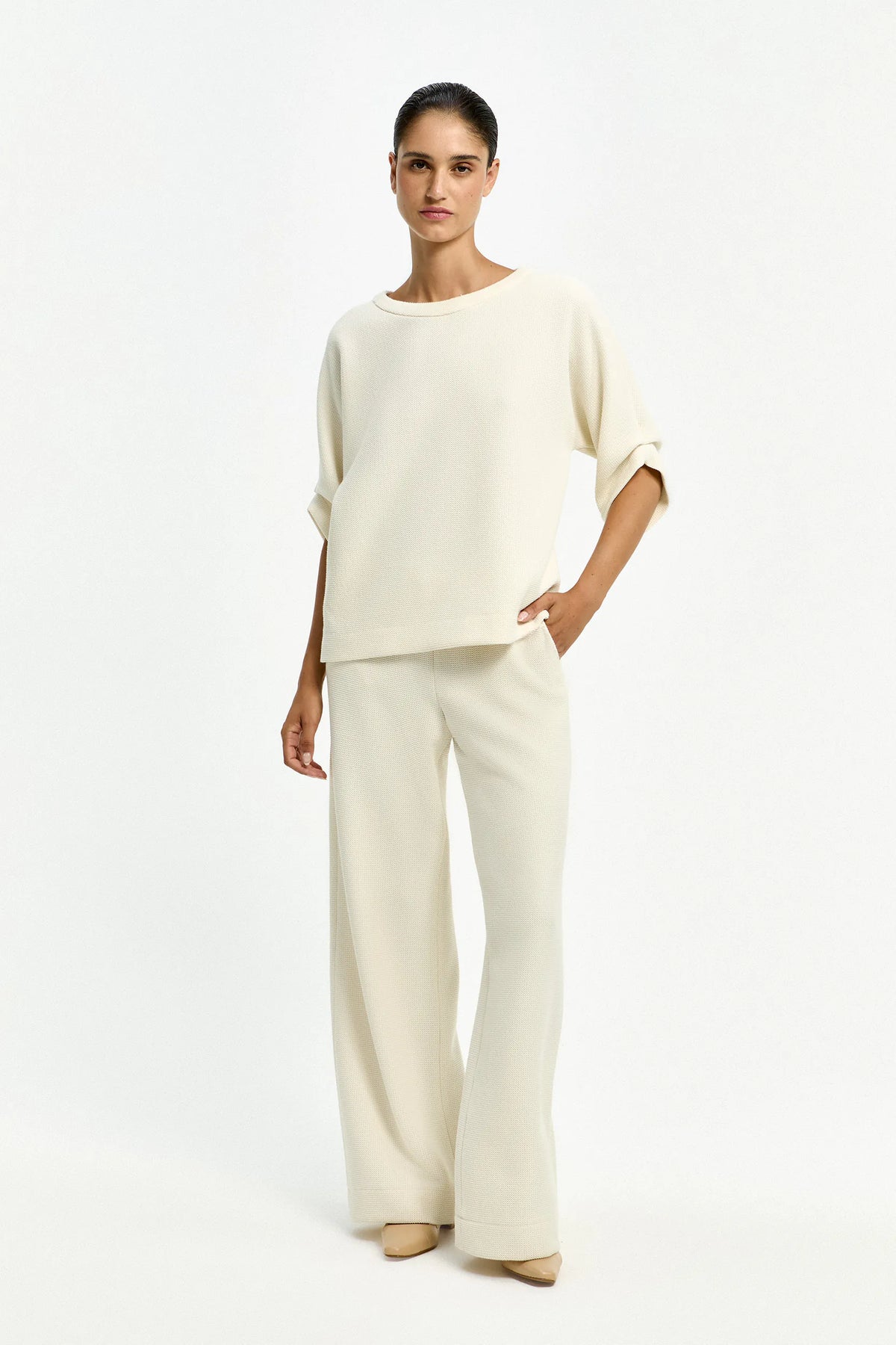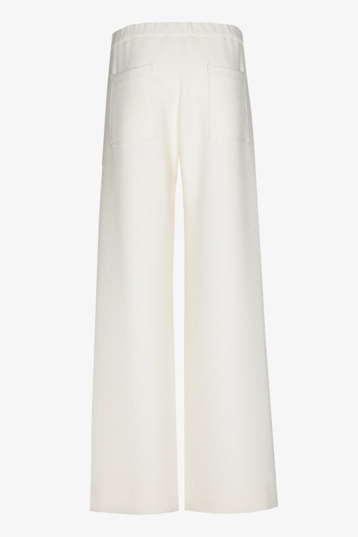 Deze elegante rechte broek van Xandres is een toonbeeld van moderne eenvoud en luxueus comfort. Uitgevoerd in de exclusieve Mont Blanc kleur – een zachte, frisse crèmetint – ademt dit model pure verfijning en veelzijdigheid uit. Het ontwerp is vervaardigd in dezelfde gestructureerde stof als de bijhorende cardigan en het shirt van Xandres, waardoor deze broek de perfecte basis vormt voor een elegante co-ord set of twinset. De lichte structuur in de stof geeft visuele diepte en een subtiel gevoel van textuur dat zowel stijlvol oogt als aangenaam aanvoelt op de huid.