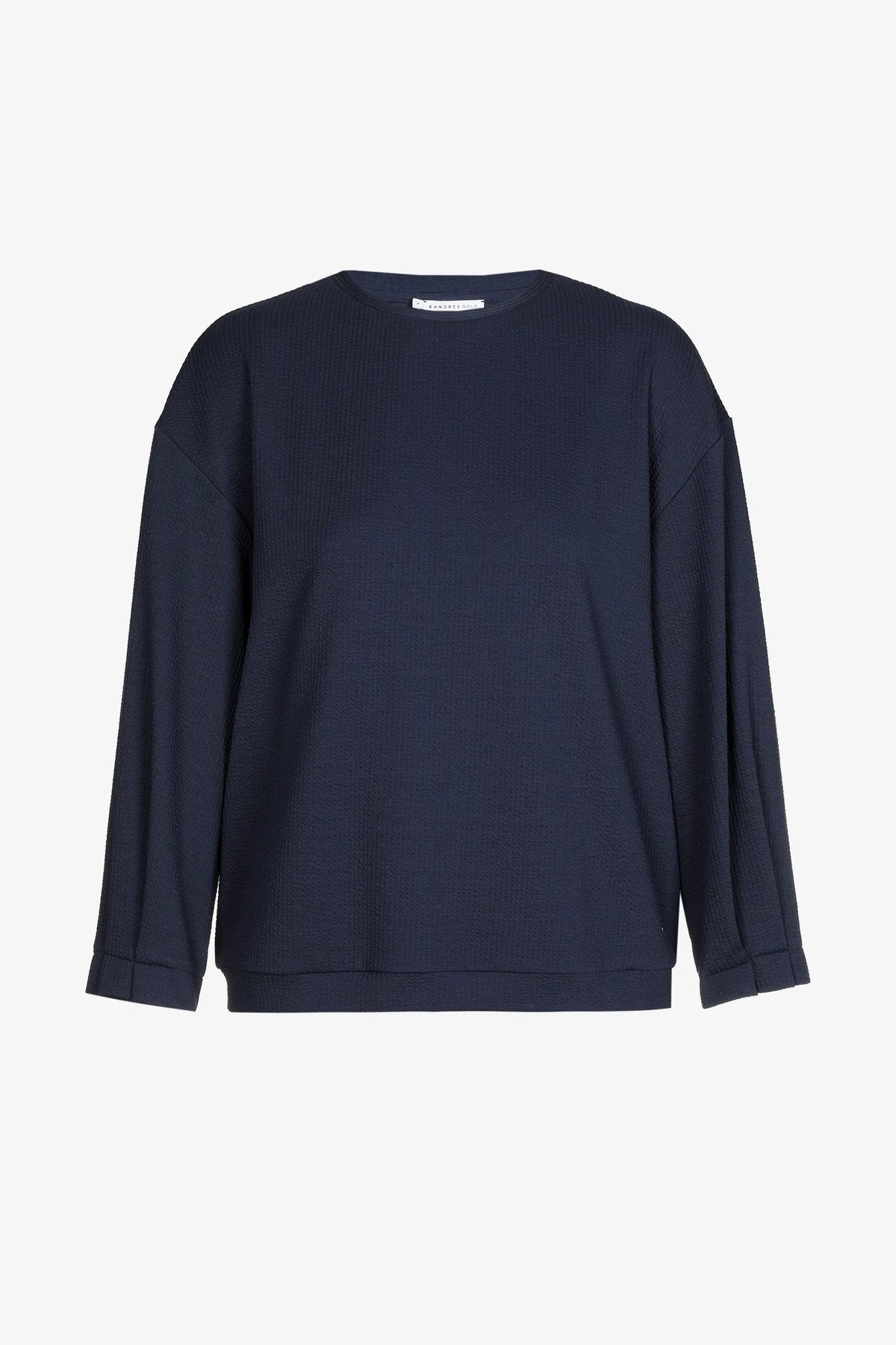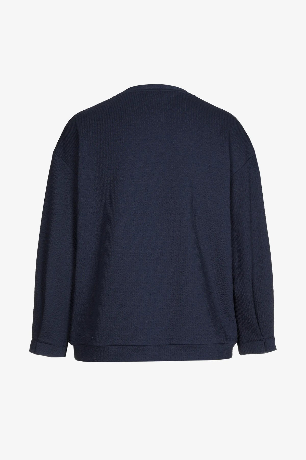 Wat dit stuk extra bijzonder maakt, is dat er een bijpassende broek beschikbaar is in exact dezelfde navy structuurstof. Draag deze trui dus als set met de broek voor een minimalistisch, modern ensemble dat perfect is voor een dag op kantoor, een etentje of een casual-chique gelegenheid. Uiteraard kan je de trui ook makkelijk combineren met een jeans of een geklede rok – het is een veelzijdige basic met net dat beetje meer.