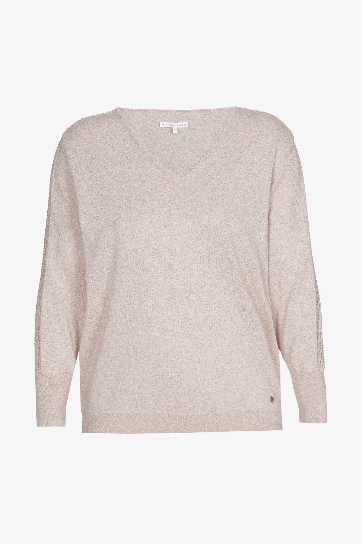 Deze vrouwelijke glittertop van Xandres is een verfijnd statement in poederroze, ontworpen voor vrouwen met een maatje meer die houden van subtiele glamour en luxueuze afwerking. De lichte, sprankelende stof vangt het licht op een elegante manier en voelt heerlijk zacht aan op de huid. Dankzij de verfijnde samenstelling met metaaldraad straalt deze top net genoeg glans uit zonder te overdrijven, waardoor het stuk moeiteloos inzetbaar is voor zowel dagelijkse elegantie als feestelijke momenten.