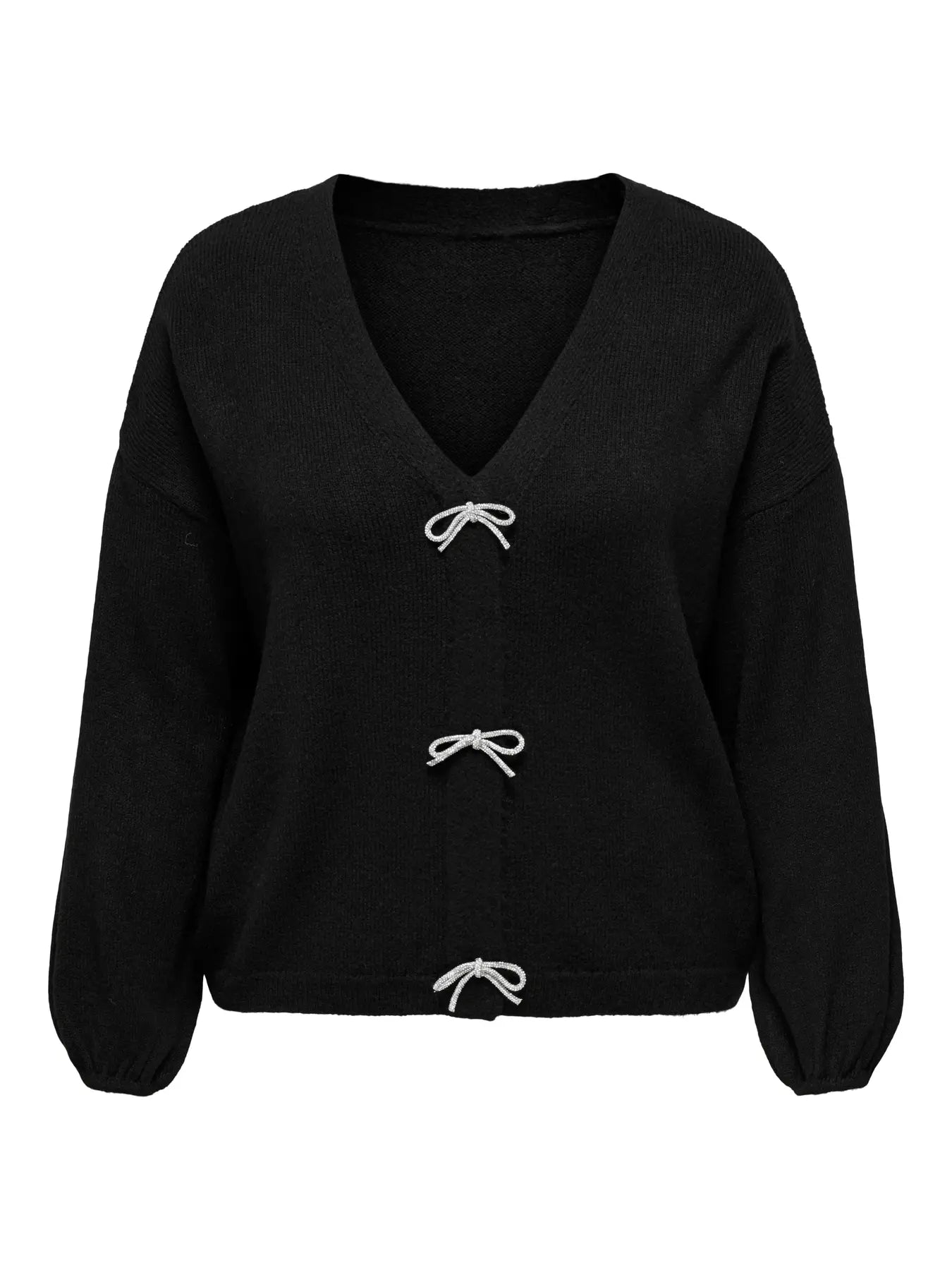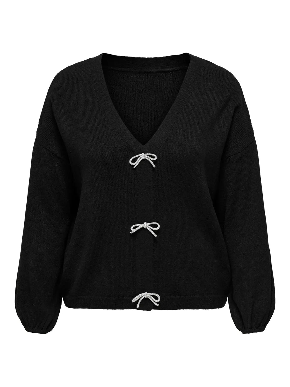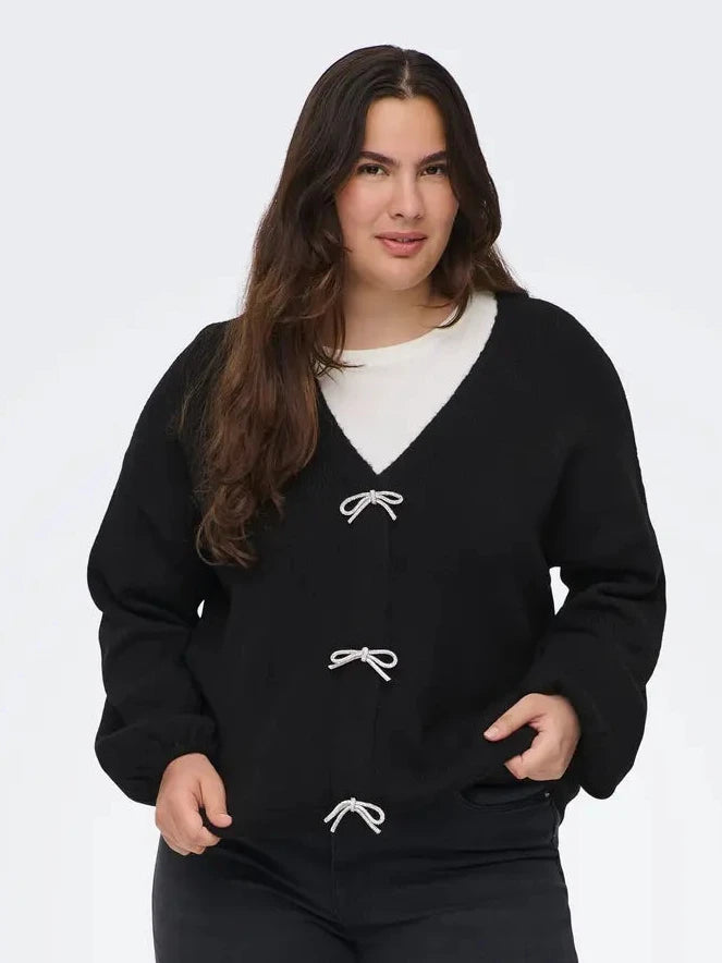 Deze zwarte trui van Only Carmakoma is het perfecte toonbeeld van speelse elegantie in grote maten dameskleding. De diepe V-halslijn en zachte gebreide stof zorgen voor een vrouwelijke, comfortabele uitstraling die meteen in het oog springt. Wat dit item écht bijzonder maakt, zijn de drie opvallende zilverkleurige strikjes als sluiting — een subtiel detail dat het verschil maakt.