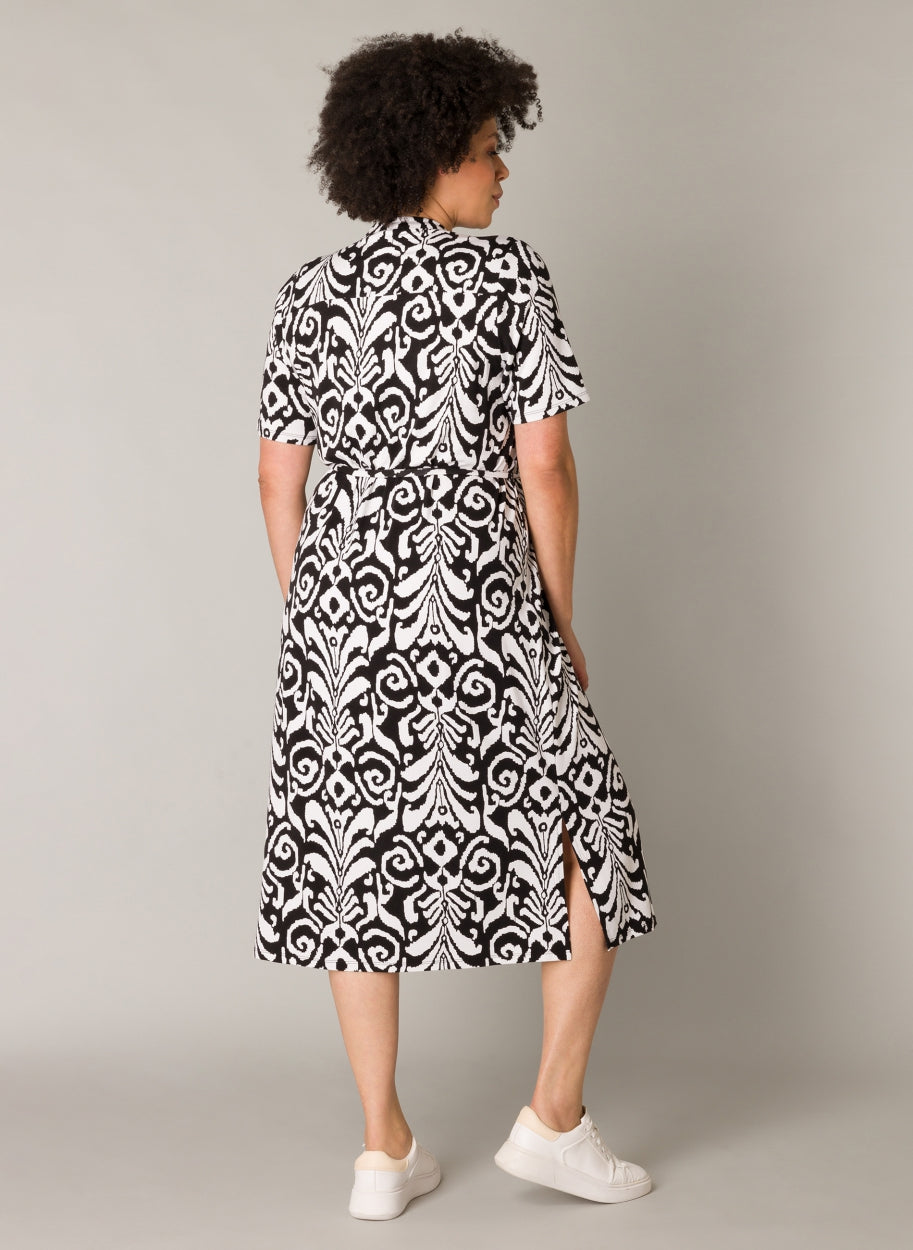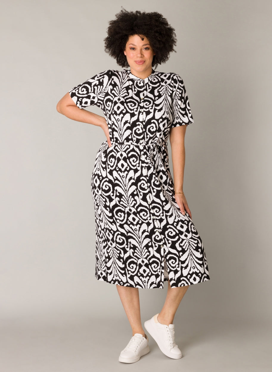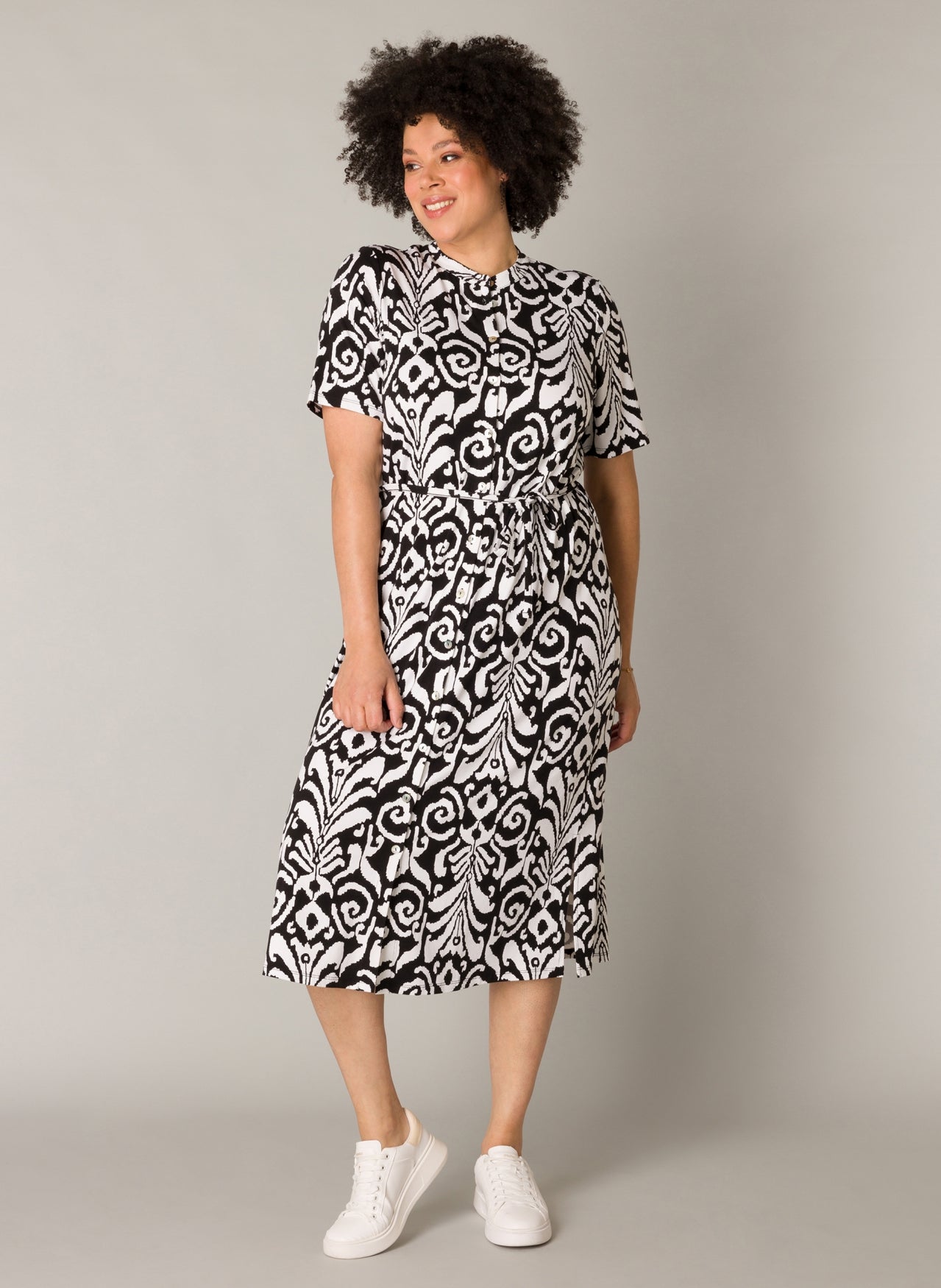 Op zoek naar een opvallende maar tijdloze jurk in grote maten dameskleding? Deze midi-jurk van Yesta met grafische zwart-witprint is een absolute eyecatcher in jouw plussize garderobe. De zwart-witte print zorgt voor een krachtige uitstraling, terwijl de soepele stof en flatterende pasvorm je ultiem comfort bieden. Ideaal voor wie houdt van trendy grote maten kleding met een statement.