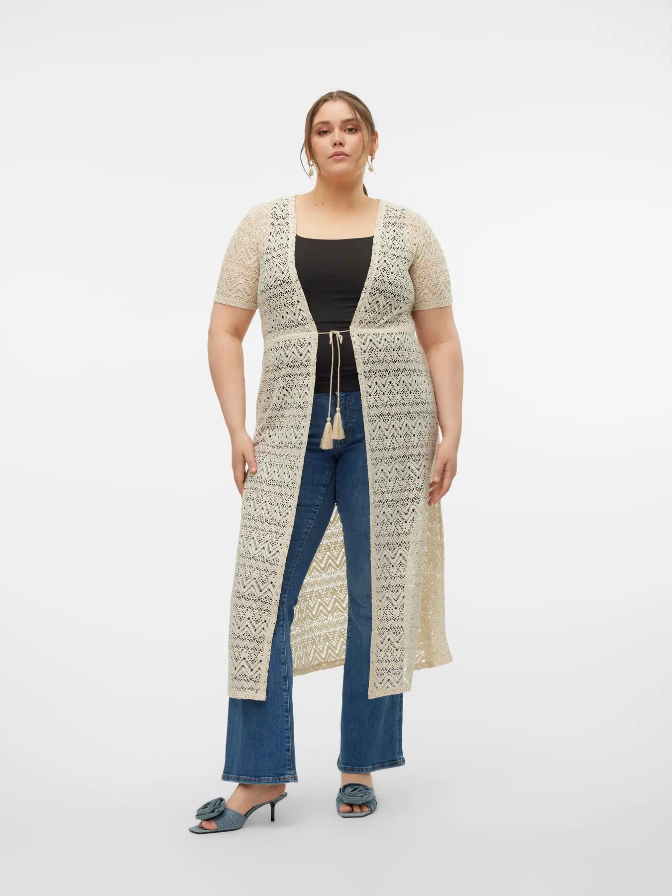 Binnen de trends van chique dameskleding grote maten zien we steeds vaker lange, luchtige vesten die een outfit net dat beetje extra geven. Dit vest is daar een perfect voorbeeld van. Het opengewerkte kantpatroon zorgt voor een romantische en vrouwelijke look, terwijl de neutrale beige kleur ervoor zorgt dat je het kledingstuk gemakkelijk kan combineren met verschillende kleuren en stijlen. Hierdoor wordt het een veelzijdig item dat je seizoen na seizoen kan blijven dragen.