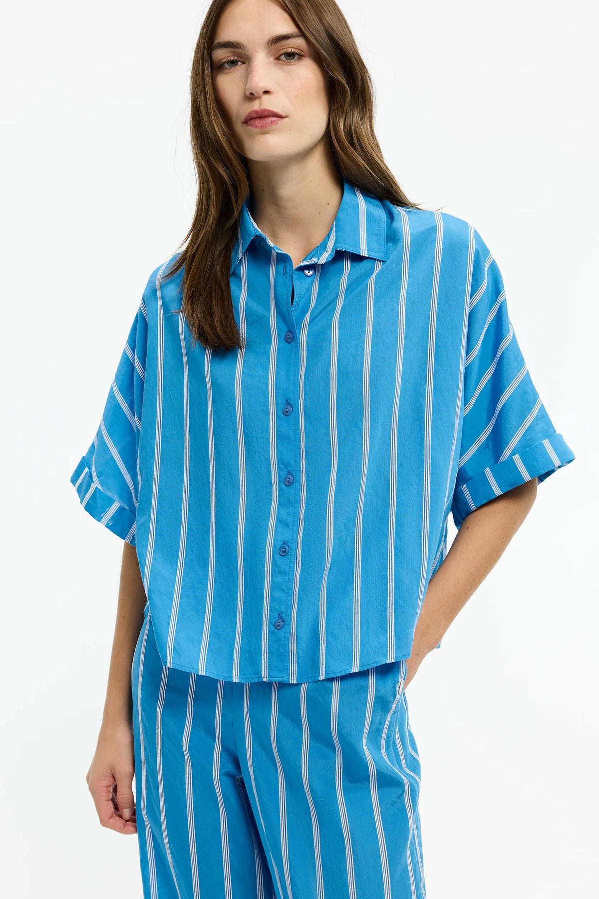 De blouse is afgewerkt met een klassieke kraag en een knoopsluiting aan de voorkant, waardoor je dit item zowel casual als chic kan dragen. De korte, wijde mouwen geven een luchtig gevoel en maken deze blouse ideaal voor warmere dagen of als stijlvolle laag in het tussenseizoen. De achterkant heeft een mooi contrast in de richting van de strepen, wat een speels detail toevoegt en deze blouse extra uniek maakt.