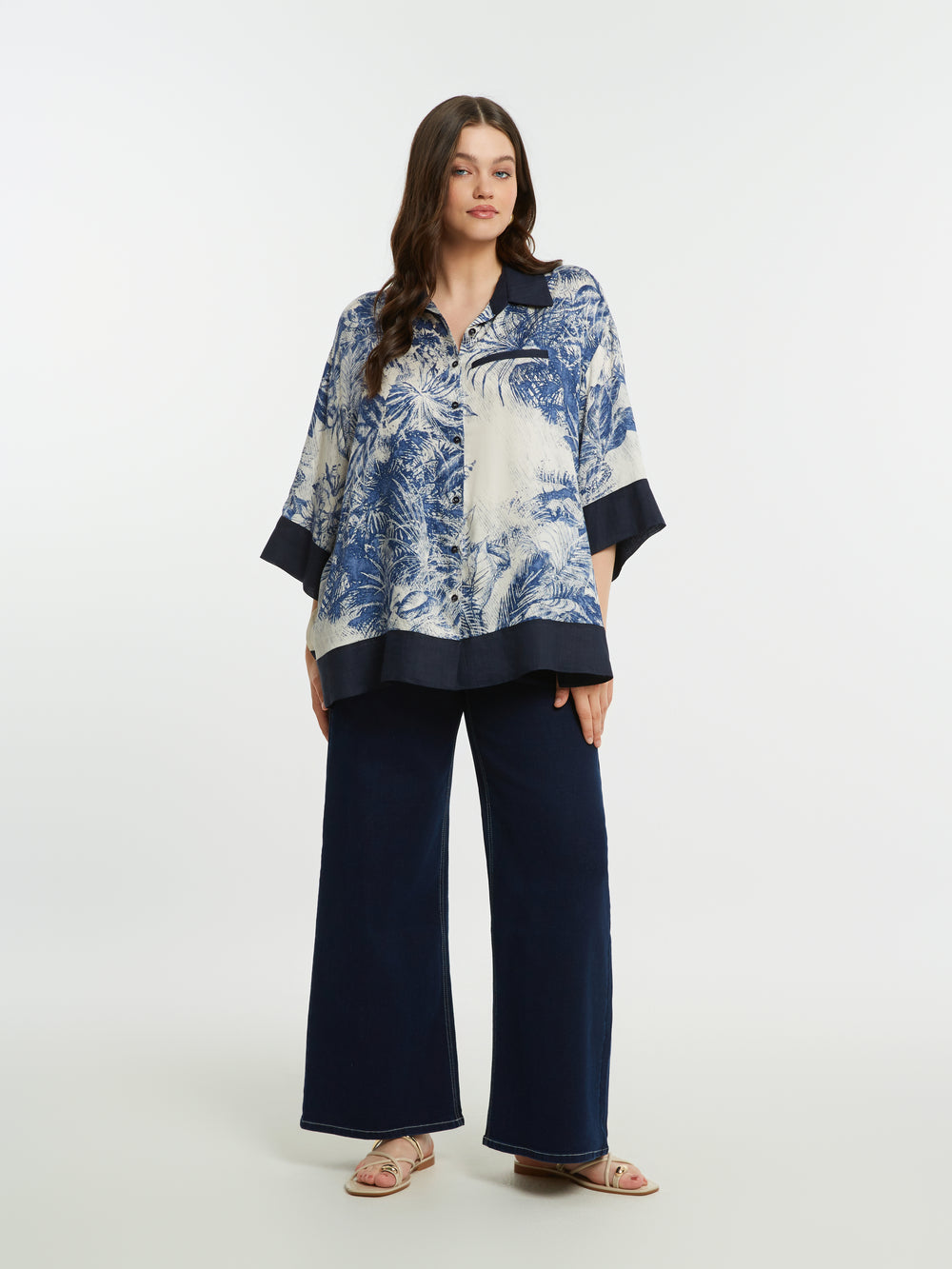 Laat je stijl moeiteloos spreken met deze luchtige blouse met botanische print van Mat Fashion – een echte eyecatcher voor vrouwen met rondingen die comfort én elegantie willen combineren. De rijke combinatie van nachtblauw en crème vormt een subtiel maar krachtig geheel, terwijl het tropische bladerpatroon zorgt voor een frisse en zomerse uitstraling. De contrasterende manchetten, knoopsluiting en kraag geven het geheel een moderne touch, perfect in balans met de speelse print. Dankzij de vloeiende en rechte pasvorm flatteert deze blouse iedere plussize silhouet, zonder in te leveren op bewegingsvrijheid of stijl.