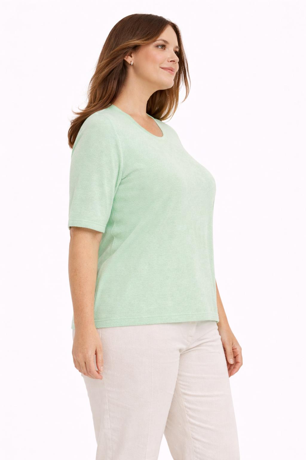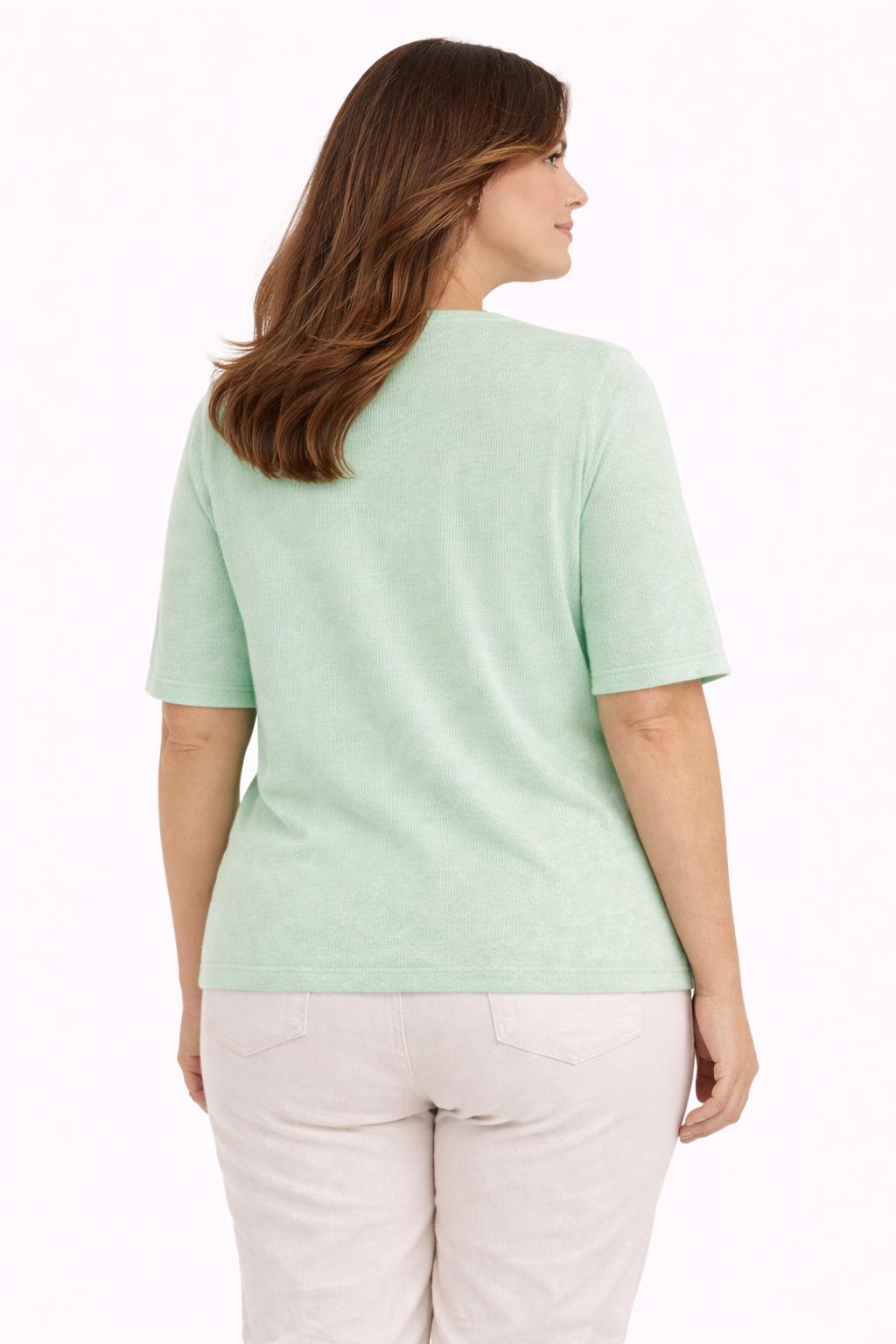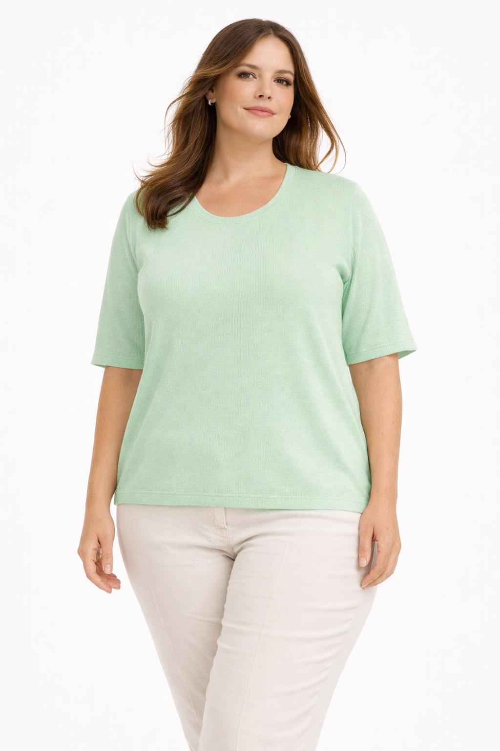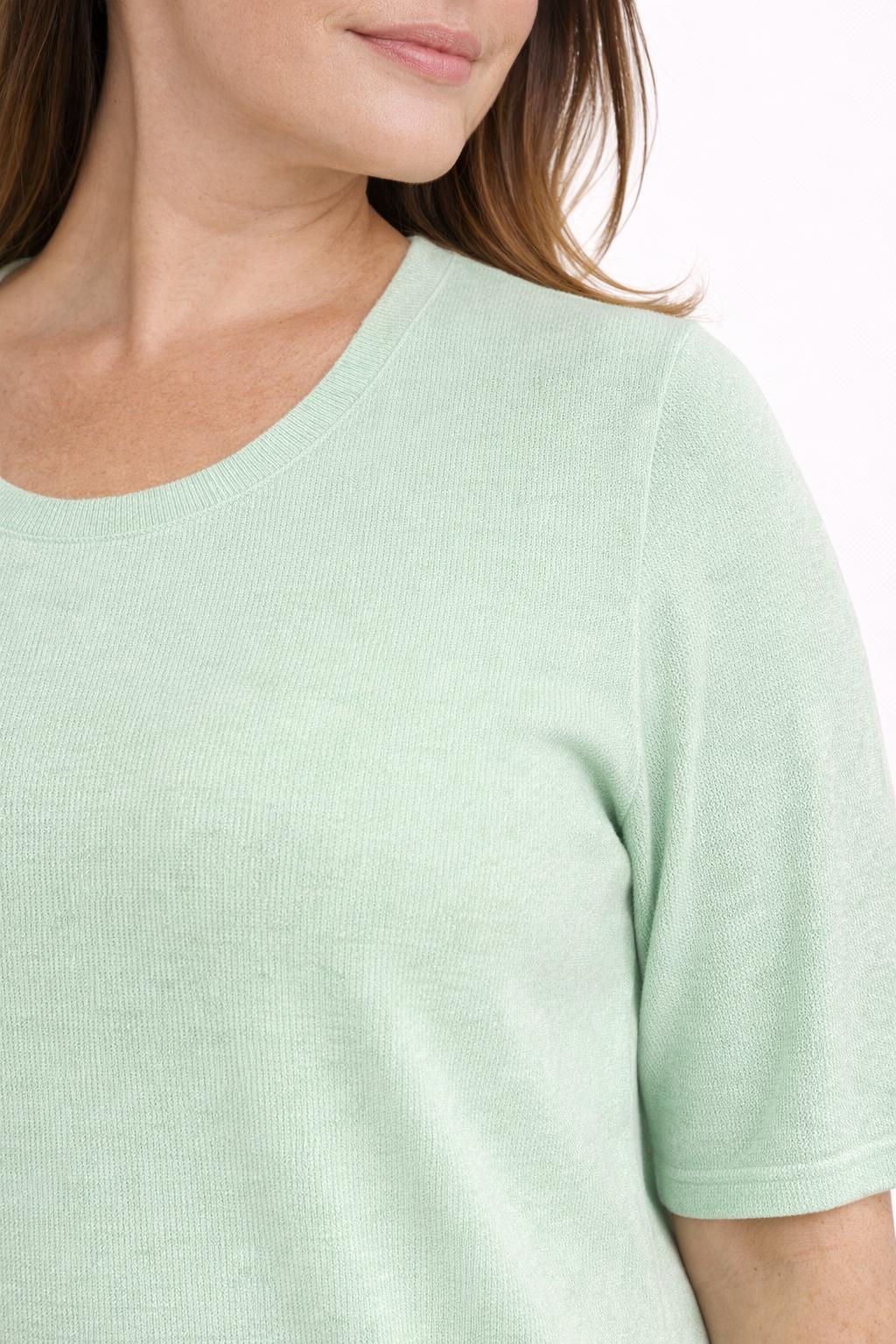 Ontdek het ultieme zomerse comfort met dit prachtig lichtgroen gebreide T-shirt van Xandres Gold, dat speciaal werd ontworpen om te combineren met het bijhorende vestje tot een stijlvolle en veelzijdige twinset. Deze top in zachte, luxueuze kwaliteit is een absolute must-have voor wie houdt van een vrouwelijke, verfijnde én duurzame look. De groene kleur straalt frisheid en elegantie uit, perfect voor het lente- en zomerseizoen.