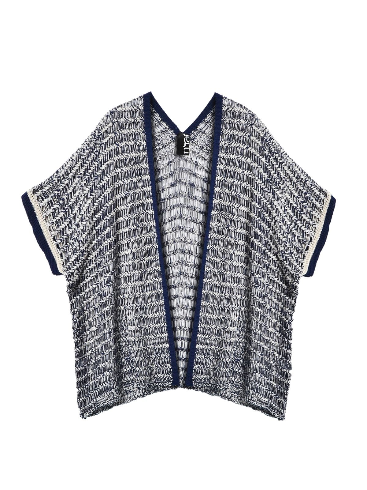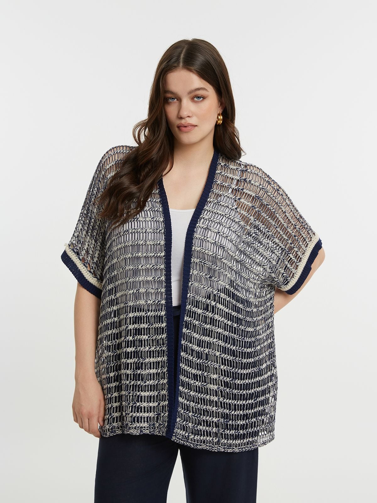 Deze gehaakte cardigan van Mat Fashion is een luchtig en makkelijk te combineren stuk binnen grote maten dameskleding. De mix van marineblauw en ecru zorgt voor een duidelijk contrast zonder druk te ogen. Het open haakwerk met horizontale en licht golvende lijnen geeft structuur aan het model, terwijl de effen marine boord langs de voorzijde en aan de mouwen het geheel afwerkt. De mouwen vallen los en wijd tot net boven de elleboog en hebben een contrasterende boord in marine met een fijne ecru rand.