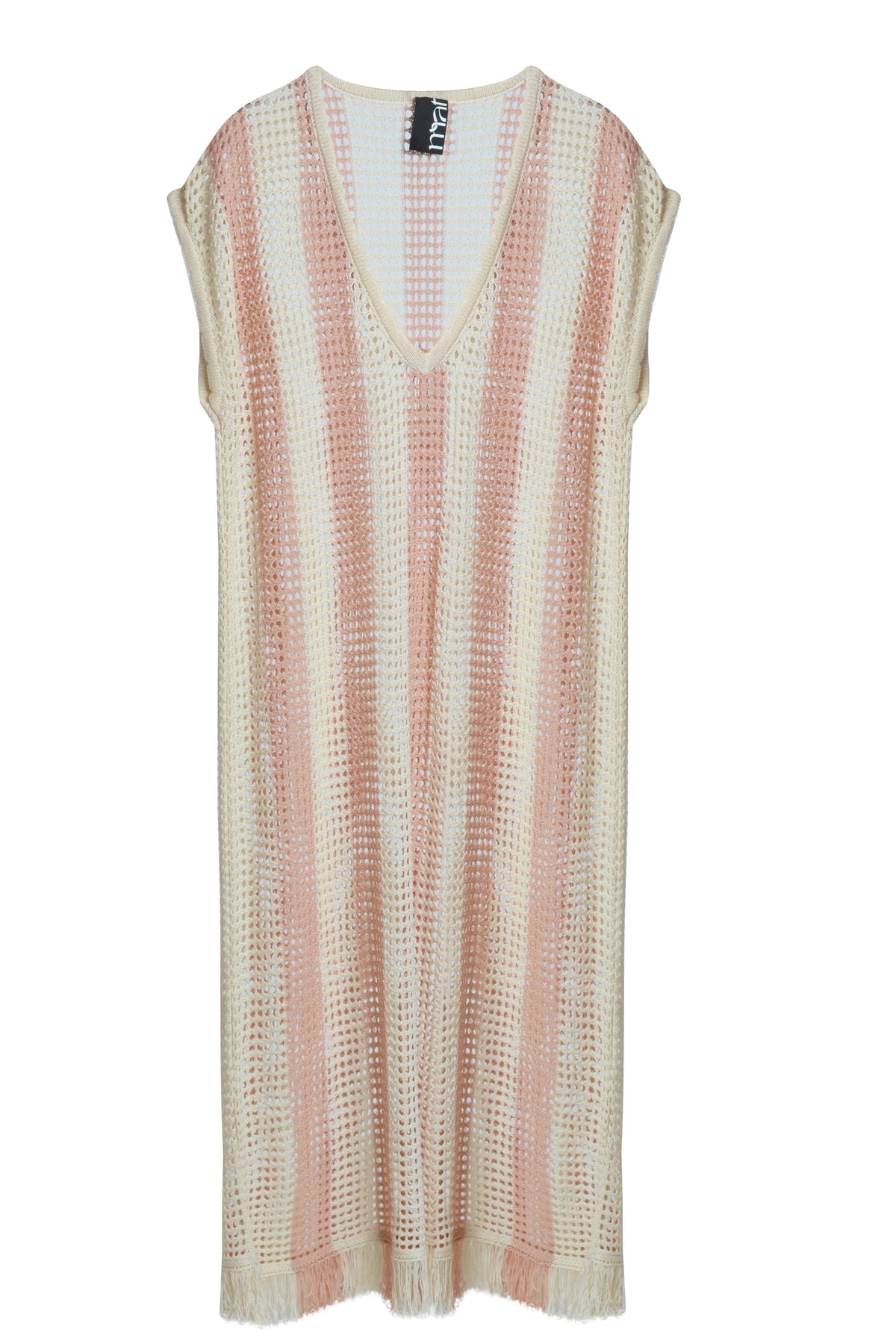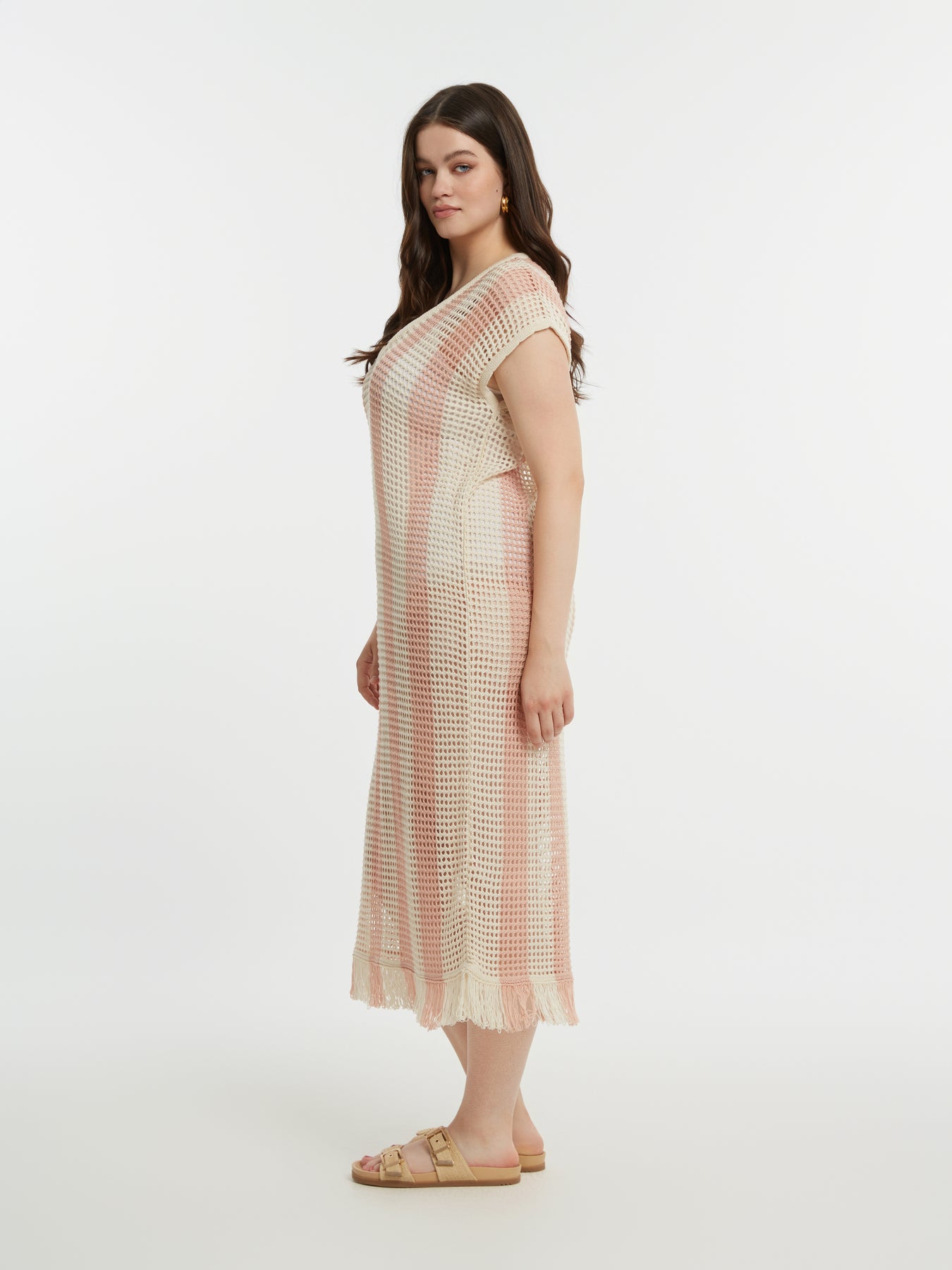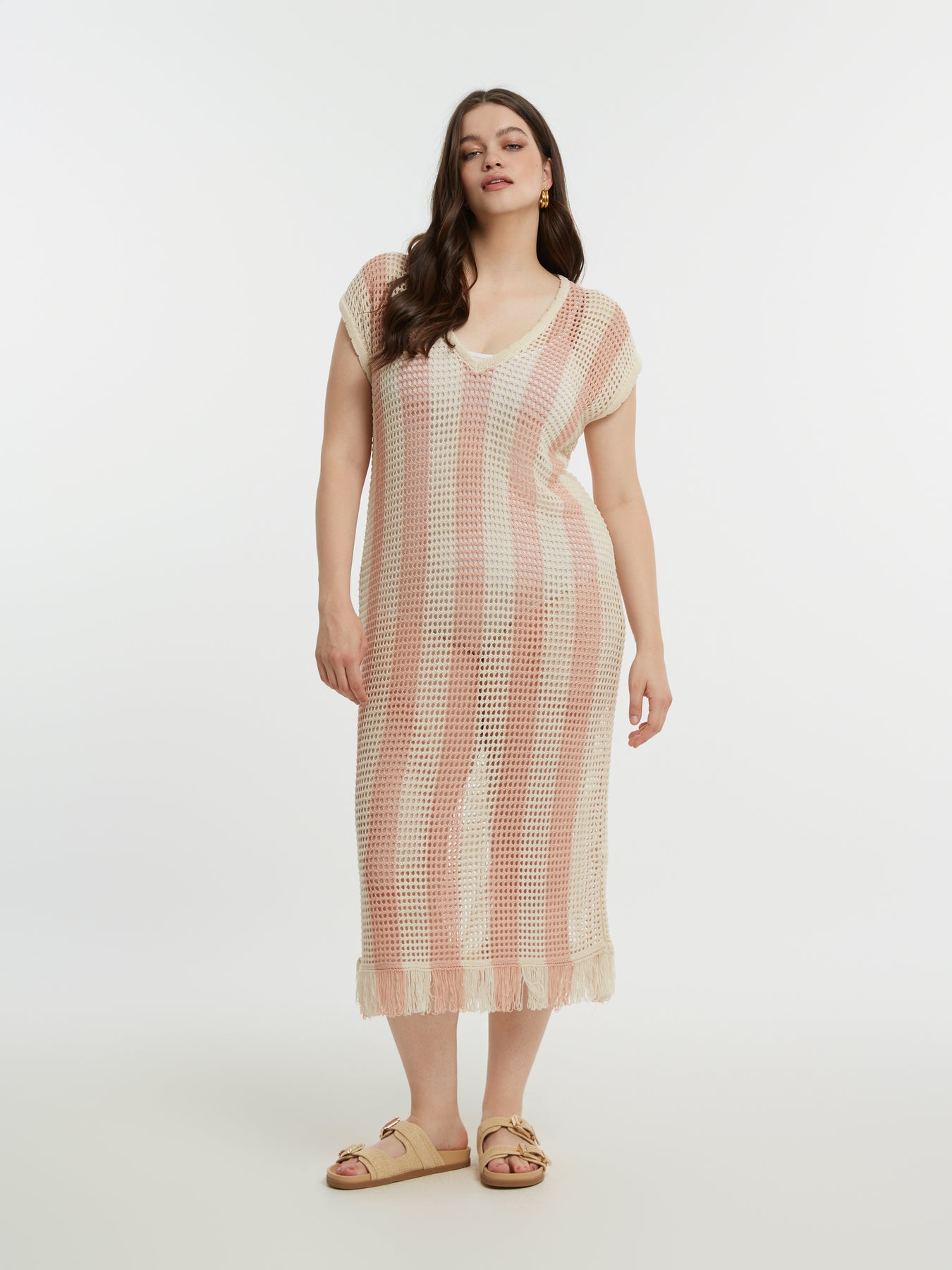 Deze gehaakte maxi jurk van Mat Fashion is een echte eyecatcher binnen de wereld van grote maten dameskleding. Het opengewerkte patroon, gecombineerd met de zachte tinten beige en poederroze in subtiele verticale strepen, geeft deze jurk een zomerse en verfijnde uitstraling. Dit is pure plussize fashion met karakter: luchtig, vrouwelijk en moeiteloos stijlvol. De V-hals aan zowel de voor- als achterkant zorgt voor een elegante belijning en laat de hals en schouders mooi uitkomen, terwijl de korte mouwen het geheel een ontspannen en flatterende look geven.