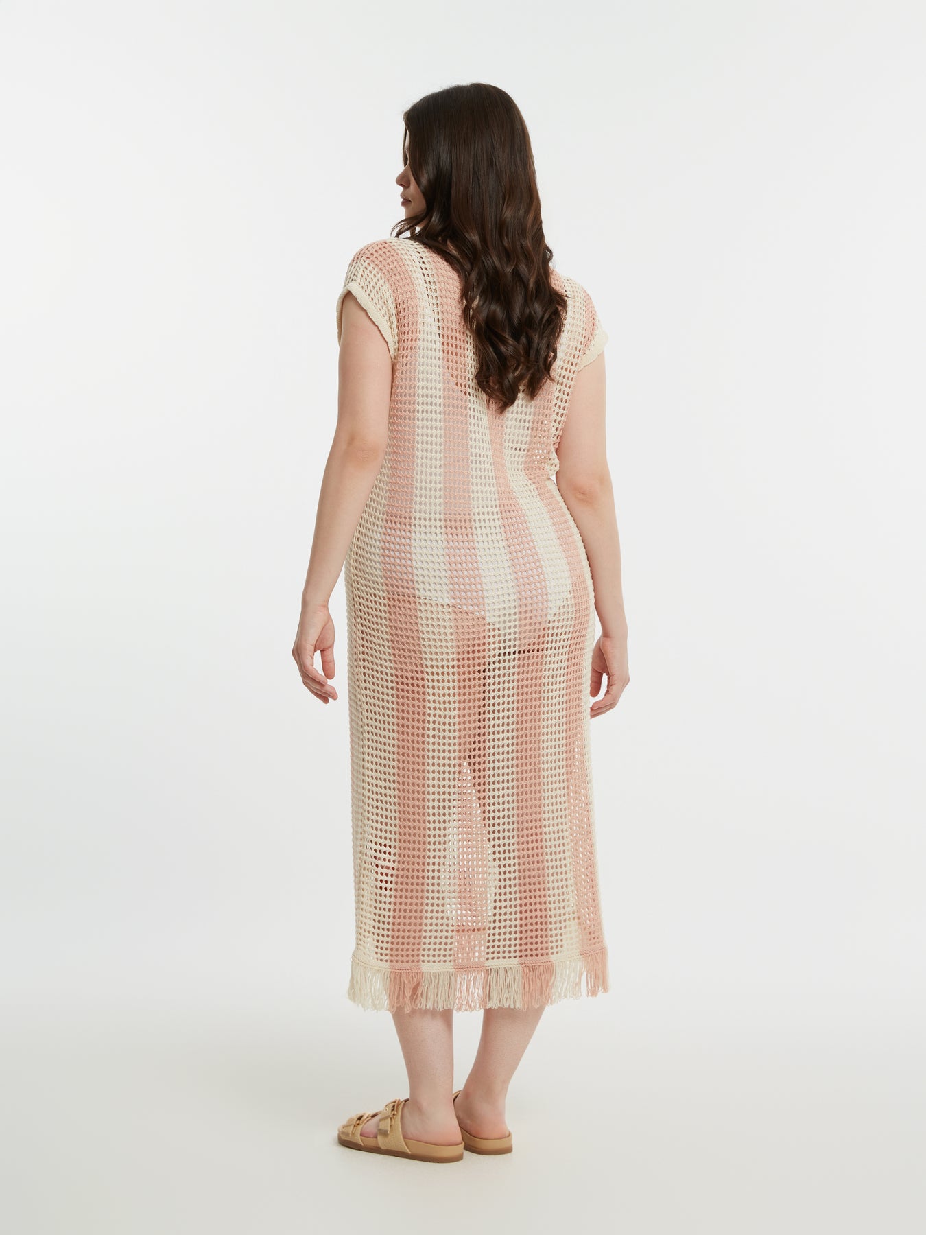 De jurk heeft een lengte van ongeveer 113 cm zonder de franjes en ongeveer 120 cm wanneer je de speelse franjes onderaan meetelt. Die fijne franjes geven extra beweging aan het silhouet en zorgen voor een subtiele boho touch. Dankzij de rechte, soepelvallende pasvorm valt deze jurk losjes langs het lichaam, ideaal voor kleding voor vrouwen met rondingen die comfort en uitstraling willen combineren. Het open haakwerk creëert een luchtig effect, perfect als strandjurk over badkleding of als statement piece over een onderjurk of lange top.