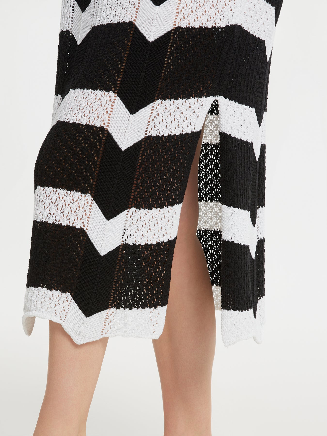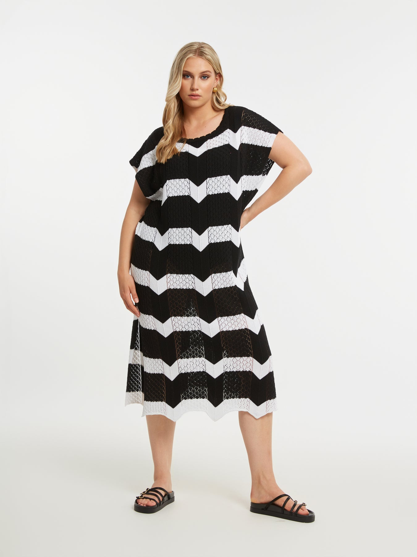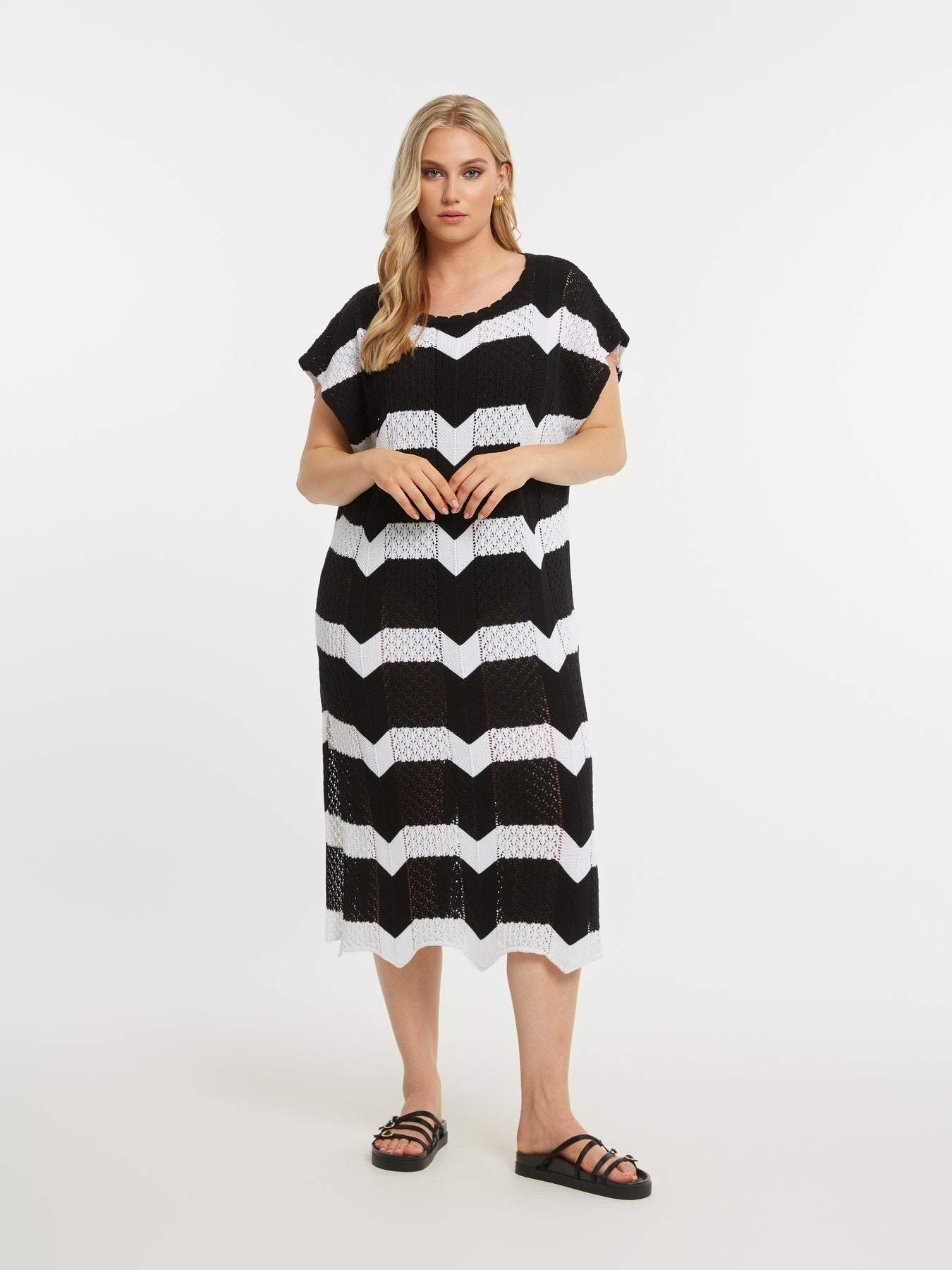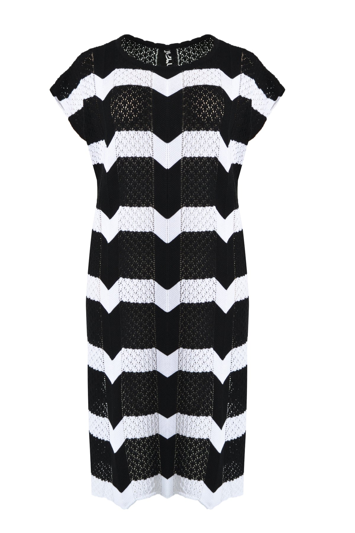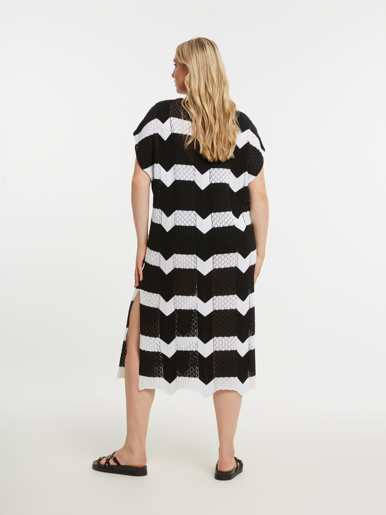Deze gehaakte jurk van mat fashion is een echte blikvanger binnen grote maten dameskleding. Het zwart-witte zigzagpatroon geeft een krachtig grafisch effect, terwijl de opengewerkte haakstructuur zorgt voor een luchtige, zomerse uitstraling. De jurk heeft aangesneden mouwen die soepel over de schouders vallen en subtiel lengte geven aan het bovenlichaam. Met een lengte van 112 cm valt ze mooi tot over de knie en dankzij de zijsplit van 40 cm ontstaat er extra bewegingsvrijheid en een elegante lijn wanneer je loopt.