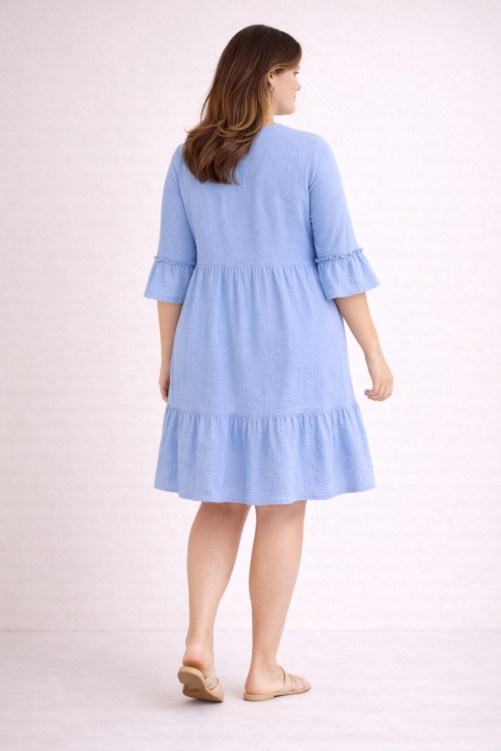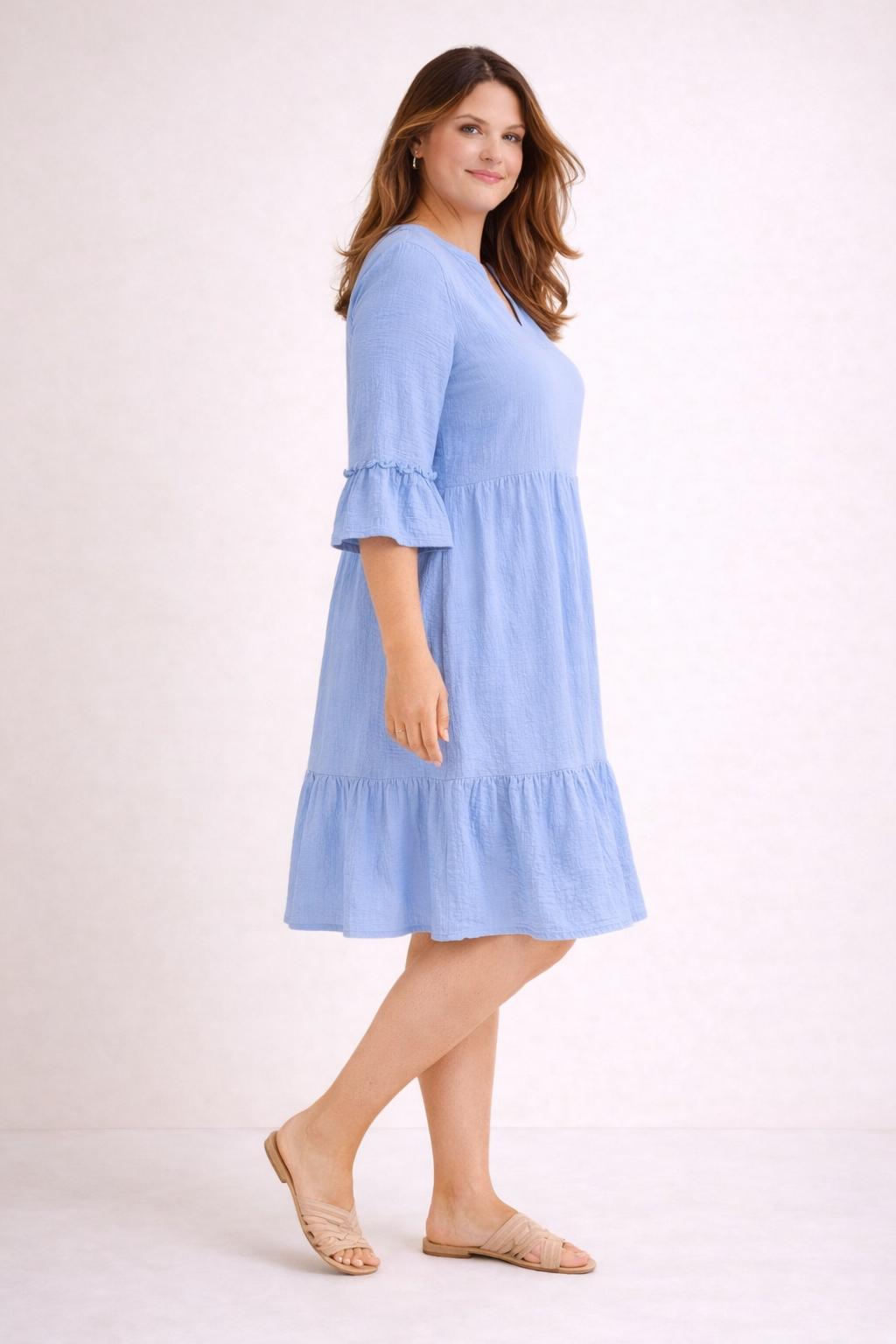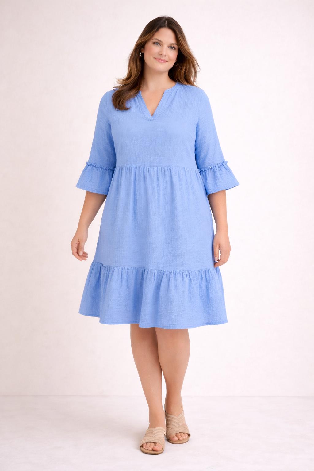 Deze lichtblauwe katoenen jurk is een frisse en stijlvolle keuze binnen grote maten dameskleding en perfect voor vrouwen die houden van plussize fashion met een luchtig, comfortabel karakter. In dameskleding grote maten is dit een jurk die meteen opvalt door haar zachte kleur, flatterende snit en natuurlijke uitstraling. Dankzij het gebruik van ademend katoen voelt deze jurk heerlijk aan op de huid en is ze ideaal als comfortabele plussize kleding voor elke dag. Dit model sluit prachtig aan bij kleding voor vrouwen met rondingen die hun curvy stijl willen combineren met elegantie en draaggemak.