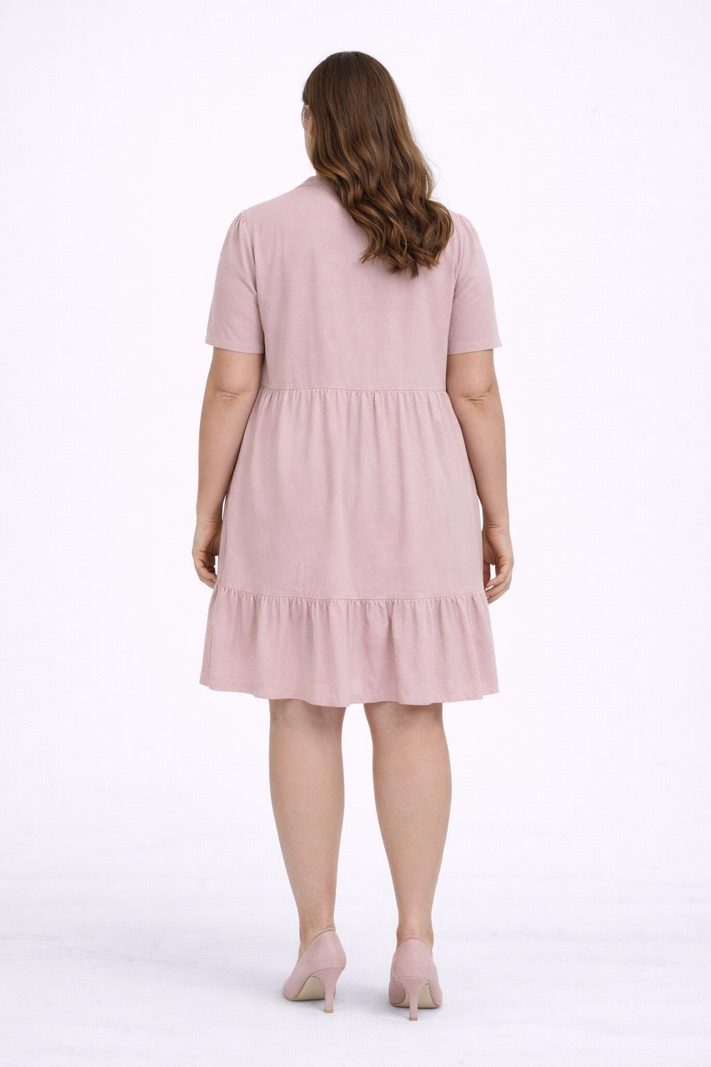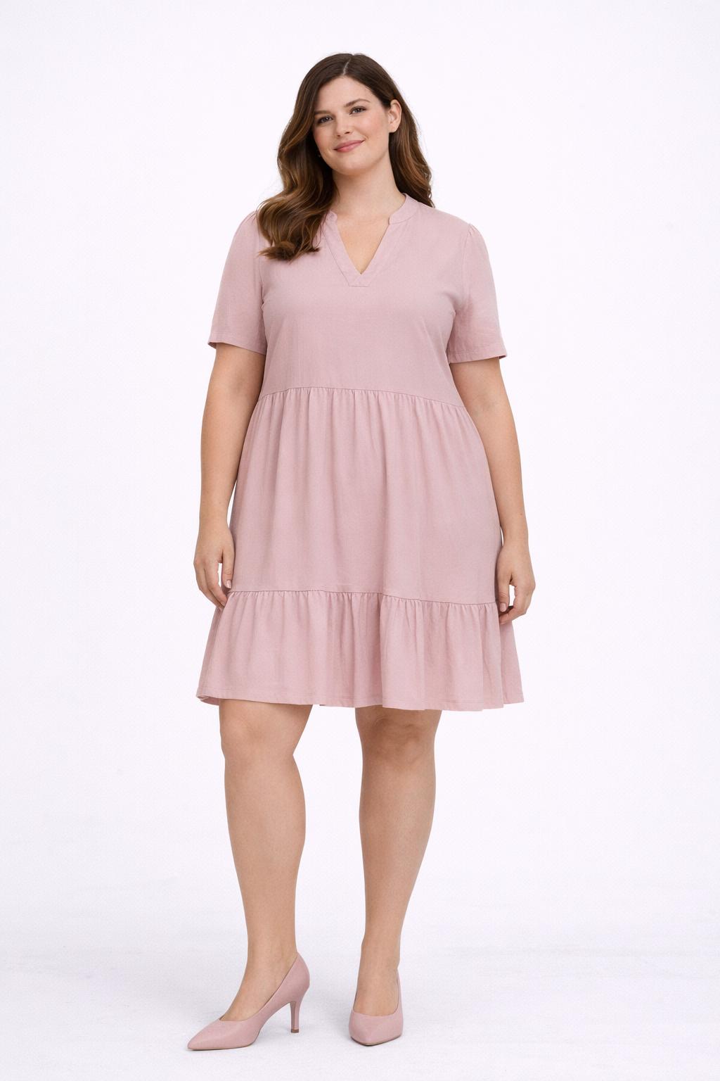Deze zachtroze linnen jurk is een prachtige toevoeging aan grote maten dameskleding en combineert moeiteloos plussize fashion met comfort en vrouwelijkheid. Binnen dameskleding grote maten is dit een ideaal model voor wie houdt van comfortabele plussize kleding met een elegante uitstraling. De luchtige stof in linnen en viscose voelt zacht aan op de huid en maakt deze jurk perfect voor kleding voor vrouwen met rondingen die hun curvy stijl graag op een natuurlijke, ontspannen manier laten spreken. De zachte roze tint geeft de jurk een frisse, vrouwelijke uitstraling die meteen charme uitstraalt.