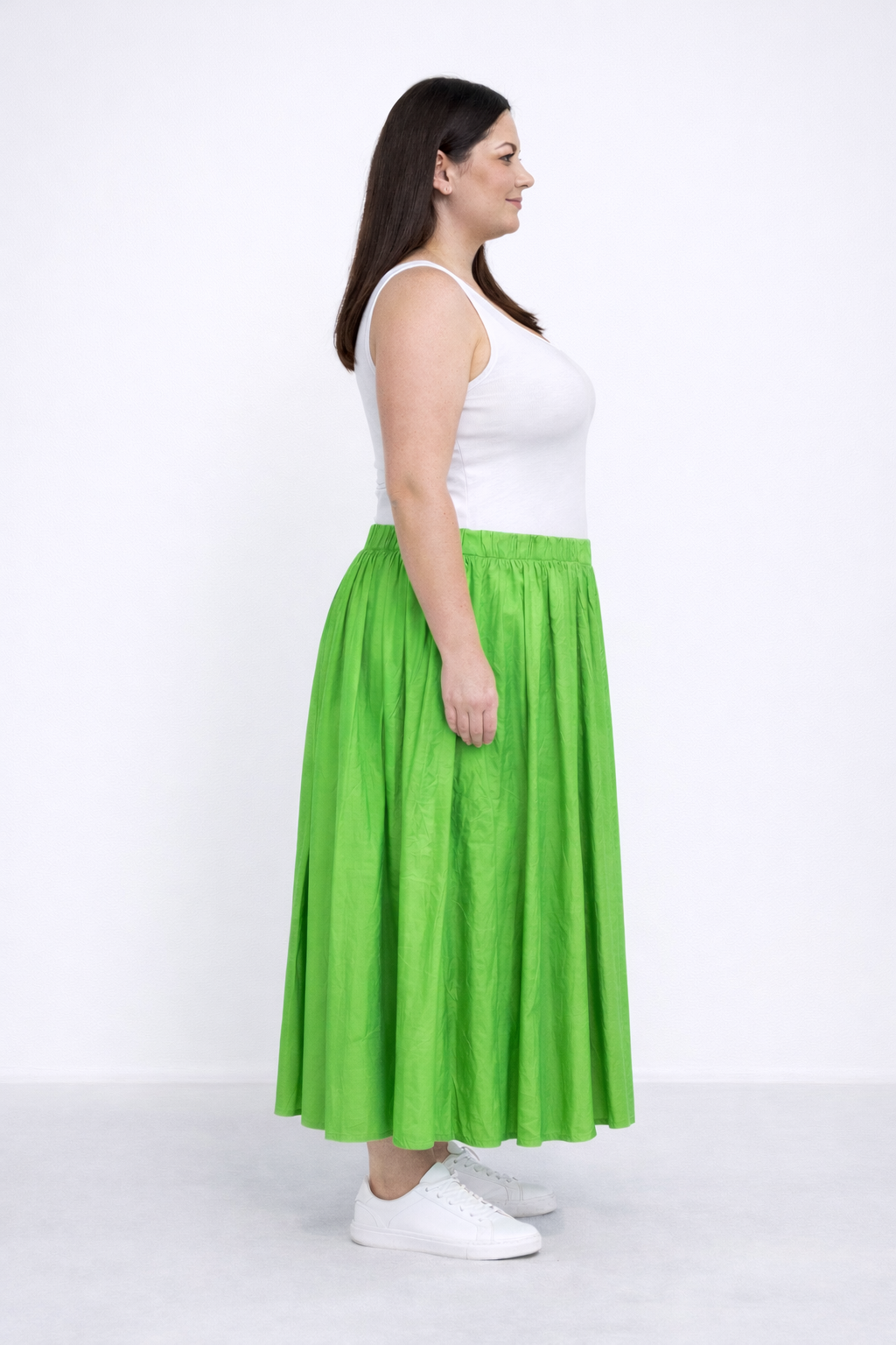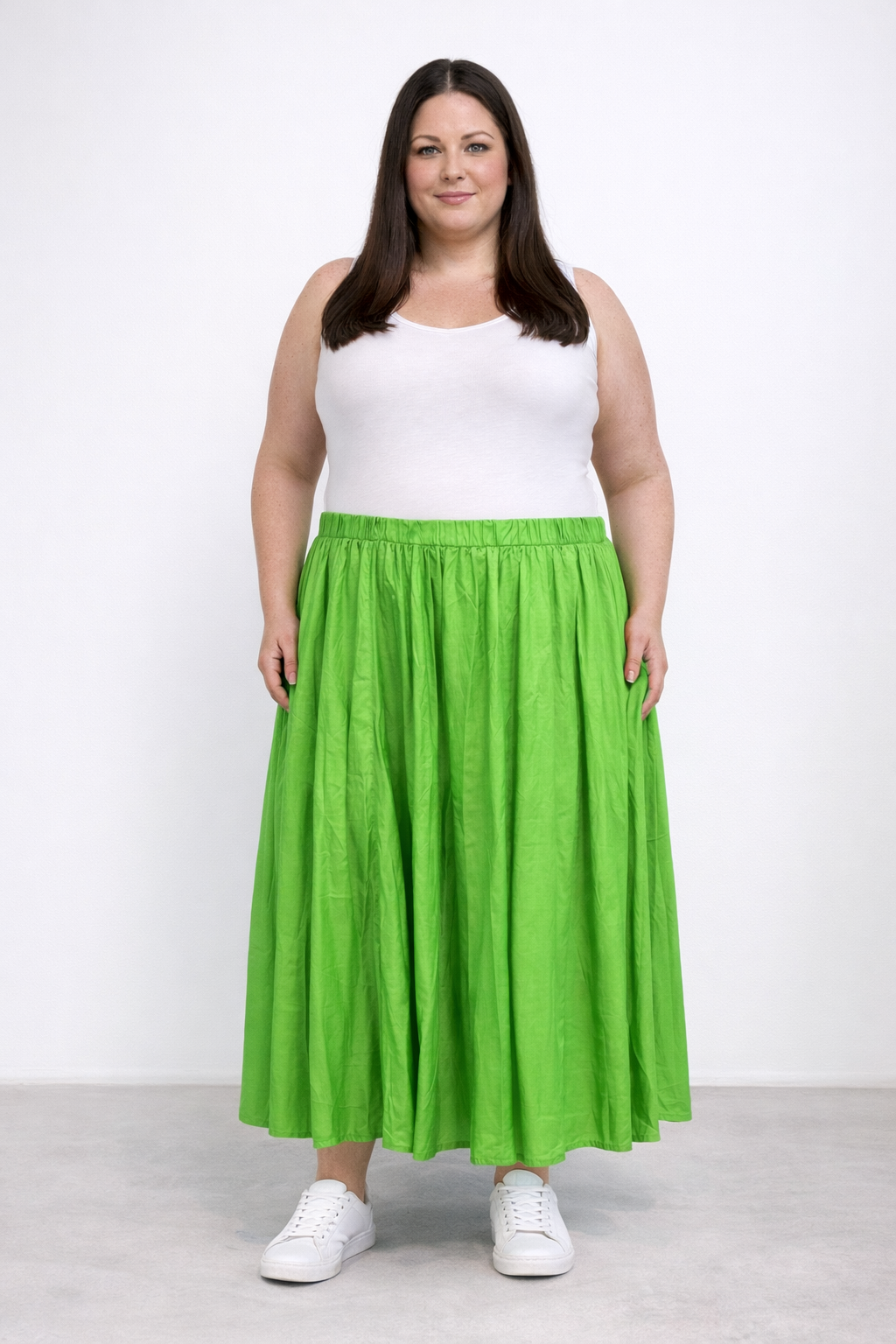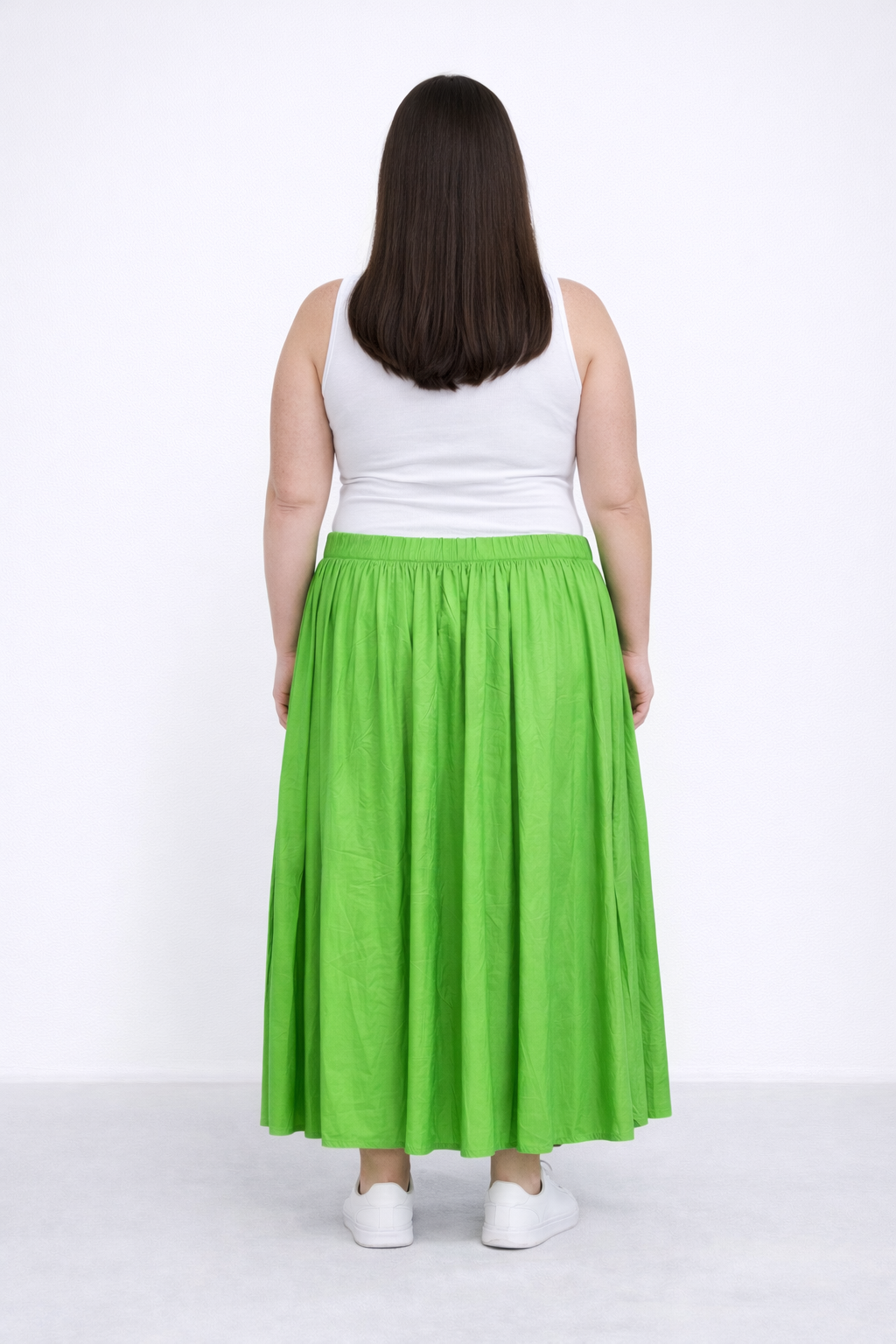 Stijlvol en veelzijdig: combineer deze groene rok met een luchtige top in wit of zand voor een zomerse outfit, of draag hem met een denim jasje en sandaaltjes voor een citytrip. Door het lichte materiaal en de natuurlijke tint is dit een rok die je keer op keer zult aantrekken. De klassieke groentint is opvallend zonder schreeuwerig te zijn, en voegt frisheid en diepte toe aan je garderobe.